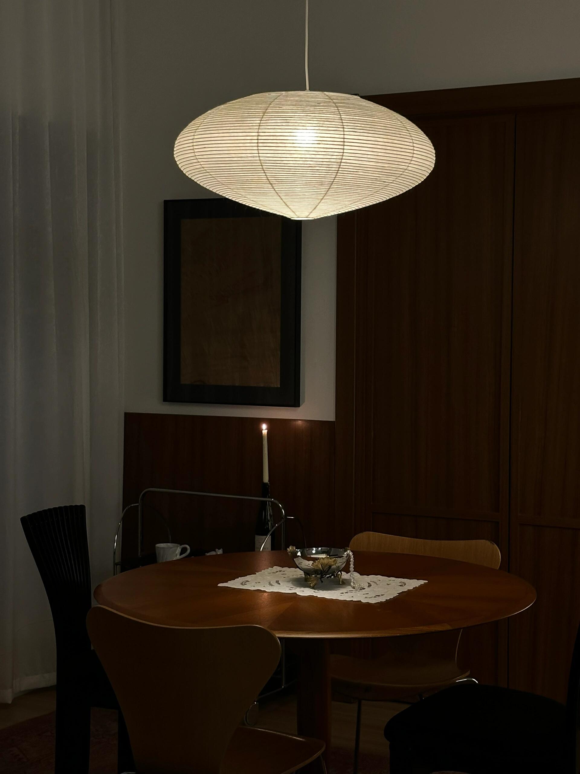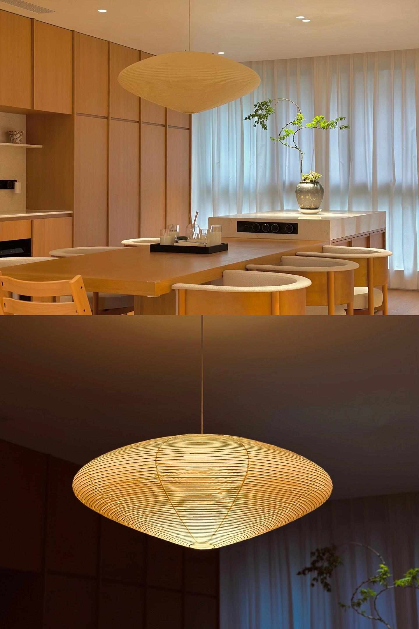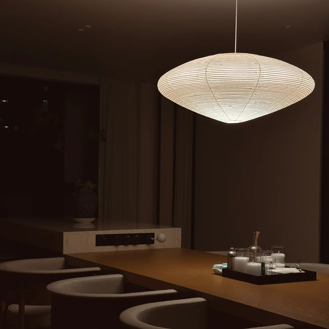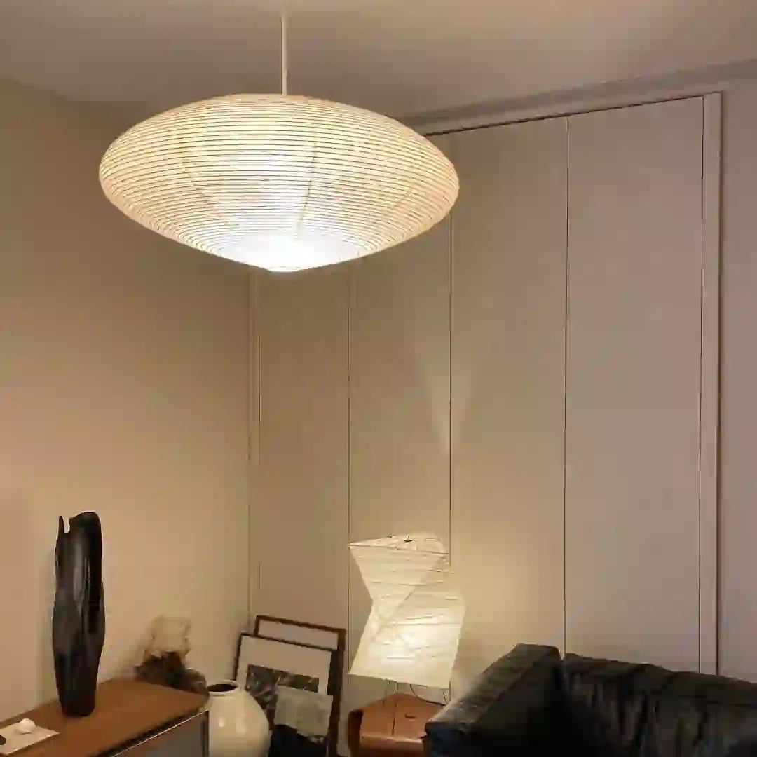 The Akari lights are handcrafted from bamboo ribbing and translucent washi paper made from the inner bark of the mulberry tree. The designer has likened the light of Akari to sunlight filtered through traditional shōji paper doors – these light sculptures create a warm glow and a pleasant ambiance. According to the designer, "All that you require to start a home are a room, a tatami, and Akari.”