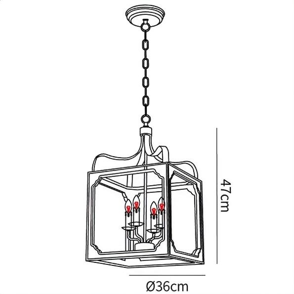 A distressed wood frame in washed grey with golden trim is held aloft by four iron arms, giving this fixture a romantic, weathered cottage-style look and feel. Place this boxy lantern-style chandelier in a foyer or group several above an island or dining table.