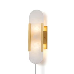 Effortlessly pairing natural alabaster and sleek metal detailing in a streamlined geometric form, the Geometric Harmony Alabaster Wall Lamp exudes a modern refinement while emphasizing the beauty of natural stone. This sconce features hand-carved natural alabaster with either Brass detailing.