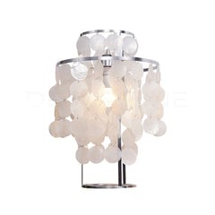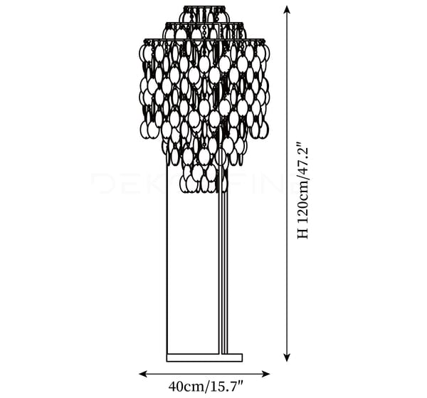 Seashells Floor Lamp is made of natural mother of pearl shells that are held to the highest quality standards and hung on stainless steel rings. The fixture has a sense of movement and life. When there is a light breeze, or you open your door, a beautiful sound is created from the shells knocking gently against each other.