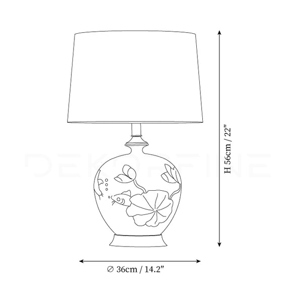 La magnifique base en céramique de cette lampe est extrêmement durable et ornée d'un motif éblouissant pour apporter une touche artistique à votre intérieur. La couleur de la base en céramique est rehaussée par un motif de poisson sculpté dans la boue et des fleurs pastel pour un look antique intemporel.