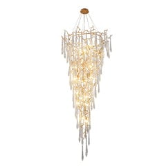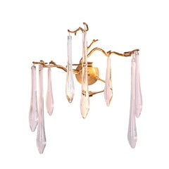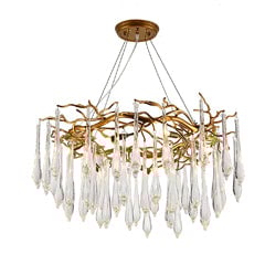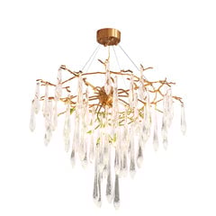 Une déclaration fascinante qui inspirera l'émerveillement d'en haut, les caractéristiques adaptées se composent de branches en laiton organiquement formées, dégoulinant de formes en goutte d'eau en verre soufflé à la main. Conçue pour jouer avec la lumière de manière enchanteresse, la lampe de plafond attirerait tous les regards dans un espace contemporain.