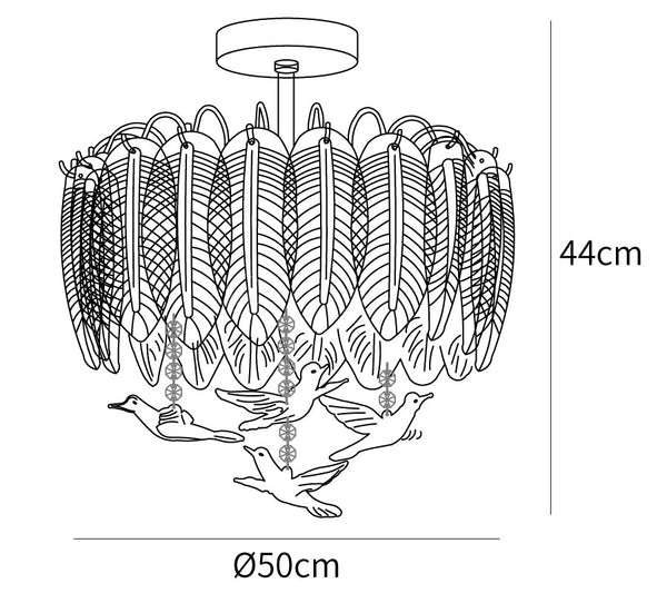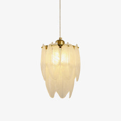 Una piuma di vetro soffiato a mano pende da una placcatura in rame. Il vetro è trasparente ma velato, diffondendo dolcemente la luce mentre crea un design pulito e nitido.