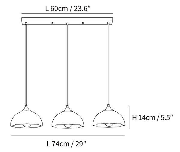 Dimensioni con 3 teste Long canopy : L 74cm x W 20cm x H 14cm / L 29″ x W 7.9″ x H 5.5″