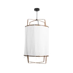 Il telaio della lampada, la piastra del soffitto e il coperchio del portalampada sono realizzati in metallo e disponibili nella finitura desiderata. Offriamo finiture in metallo nere o bianche. La rete di rattan è cucita a mano sul telaio metallico utilizzando una corda di juta naturale. Il canopy del soffitto ha la stessa finitura del telaio metallico e del coperchio del portalampada.