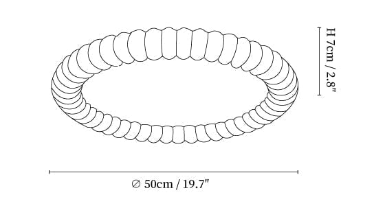 La lampada da soffitto Ripple Halo trae ispirazione dalle dolci ondulazioni dell'acqua, catturate in una forma circolare che emette un bagliore morbido e diffuso. La texture a coste lungo il perimetro evoca l'immagine di uno stagno sereno con increspature che si estendono verso l'esterno, simboleggiando tranquillità e armonia. Questo design porta un tocco di natura negli interni moderni, offrendo un'atmosfera rilassante che completa spazi minimalisti e contemporanei.