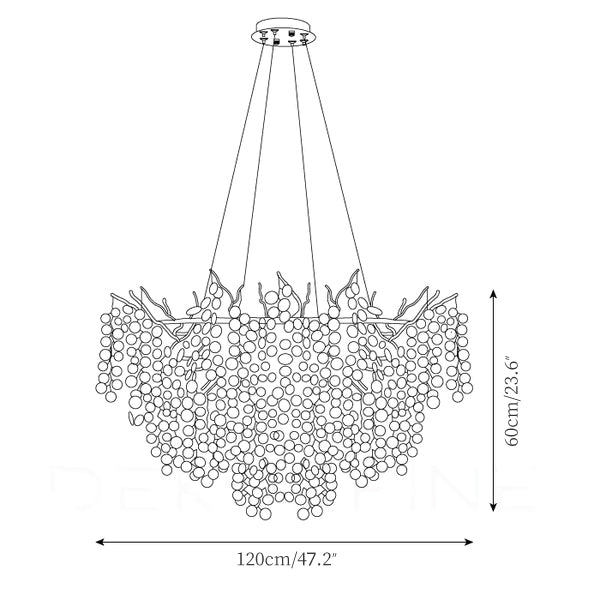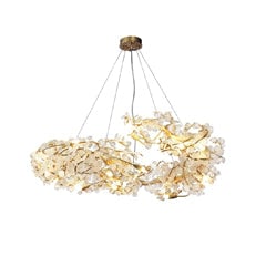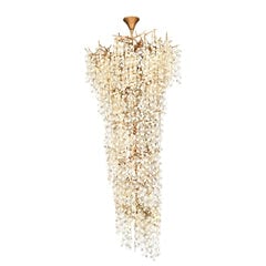 Come gocce di rugiada sotto la chioma di una foresta, la collezione di lampadari Shiro Noda presenta scintillanti monete di vetro che scendono da foglie e rami organici. Un moderno cenno alla natura, questa collezione è naturale in ambienti contemporanei. Questo lampadario è abbastanza grande da poter essere appeso in una grande stanza, in un atrio o in una sala da pranzo e soggiorno con soffitti alti.