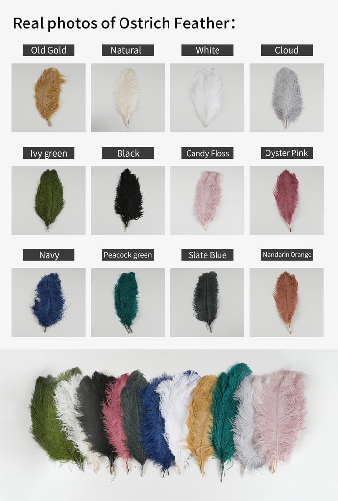 Kolor piór: Naturalny, Biały, Chmurowy, Stary złoty, Zielony bluszcz, Czarny, Waty cukrowej, Ostry róż, Mandarynkowy, Granatowy, Zielony pawia