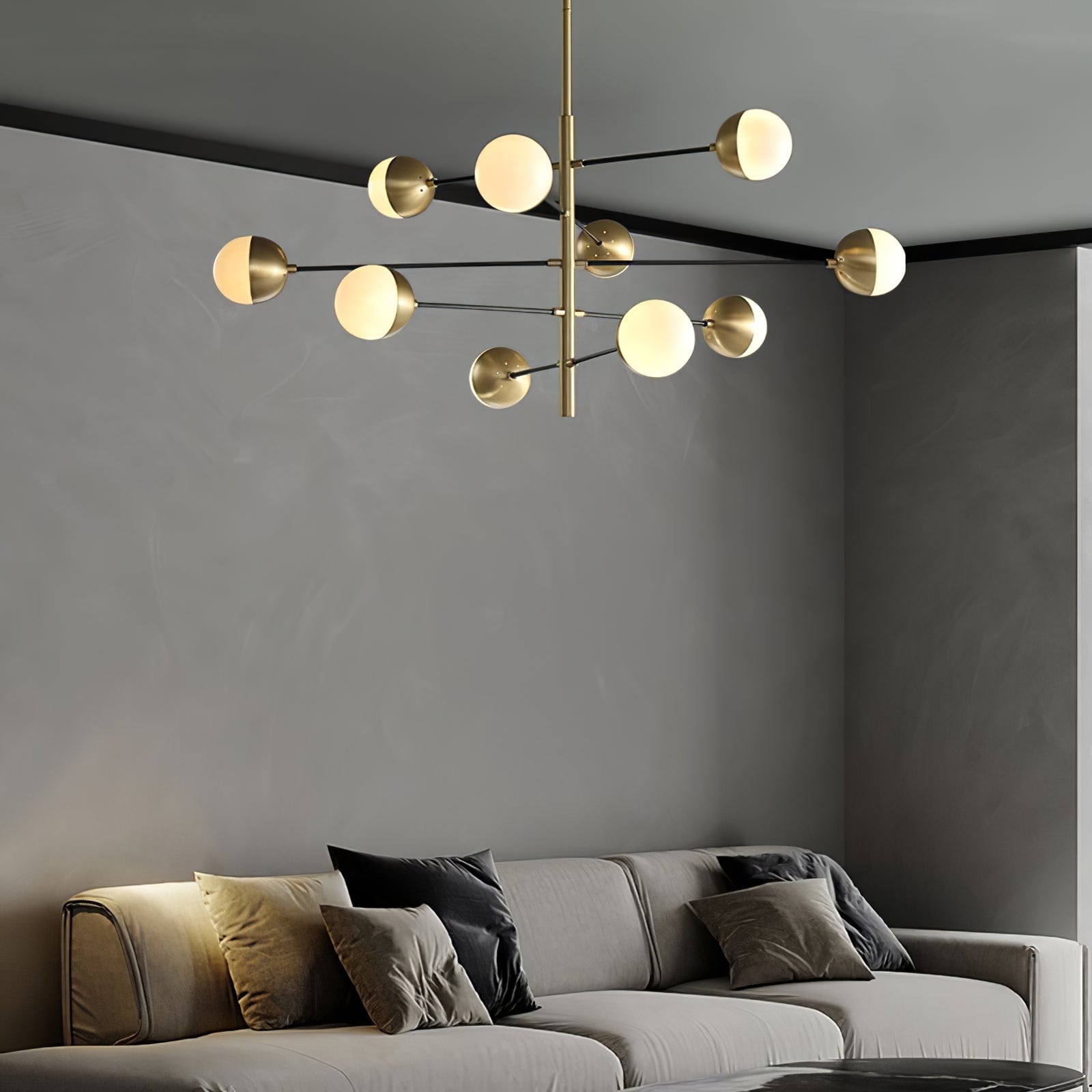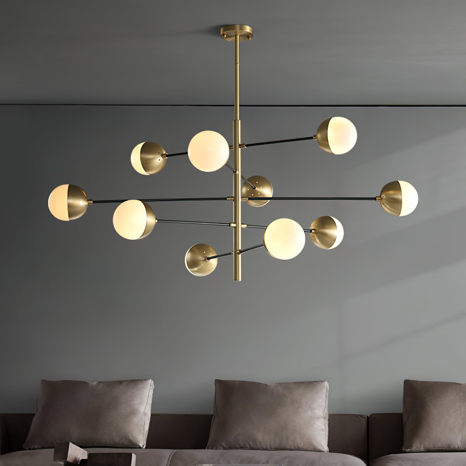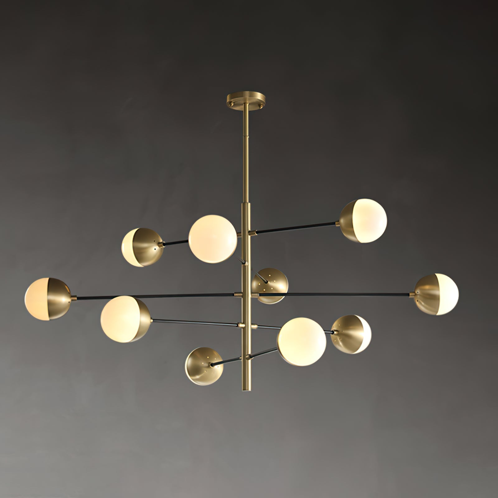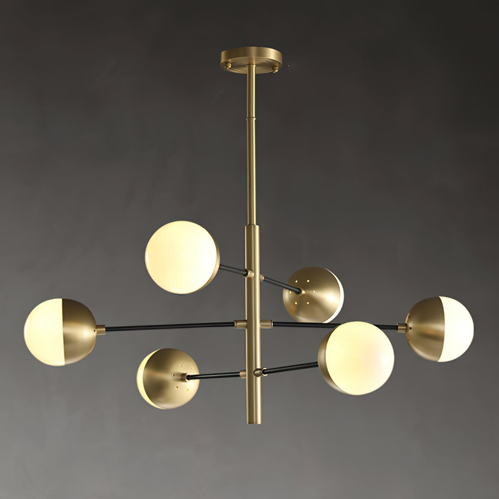 Die 10-Globe Moderne Messing-Deckenleuchte zeichnet sich durch ein elegantes Messing-Finish aus, das einen luxuriösen, aber dennoch zurückhaltenden Look verleiht. Der Globus-Schirm ist in zwei Teile unterteilt, wobei eine Hälfte mit opakem Messing bedeckt ist und die andere sanft diffuses Licht durchlässt, was einen ausgewogenen Lichteffekt erzeugt. Die klaren Linien und die geometrische Symmetrie der Lampe machen sie perfekt für zeitgenössische Innenräume, Esszimmer oder Wohnräume, die einen schlanken, modernen Akzent setzen möchten.