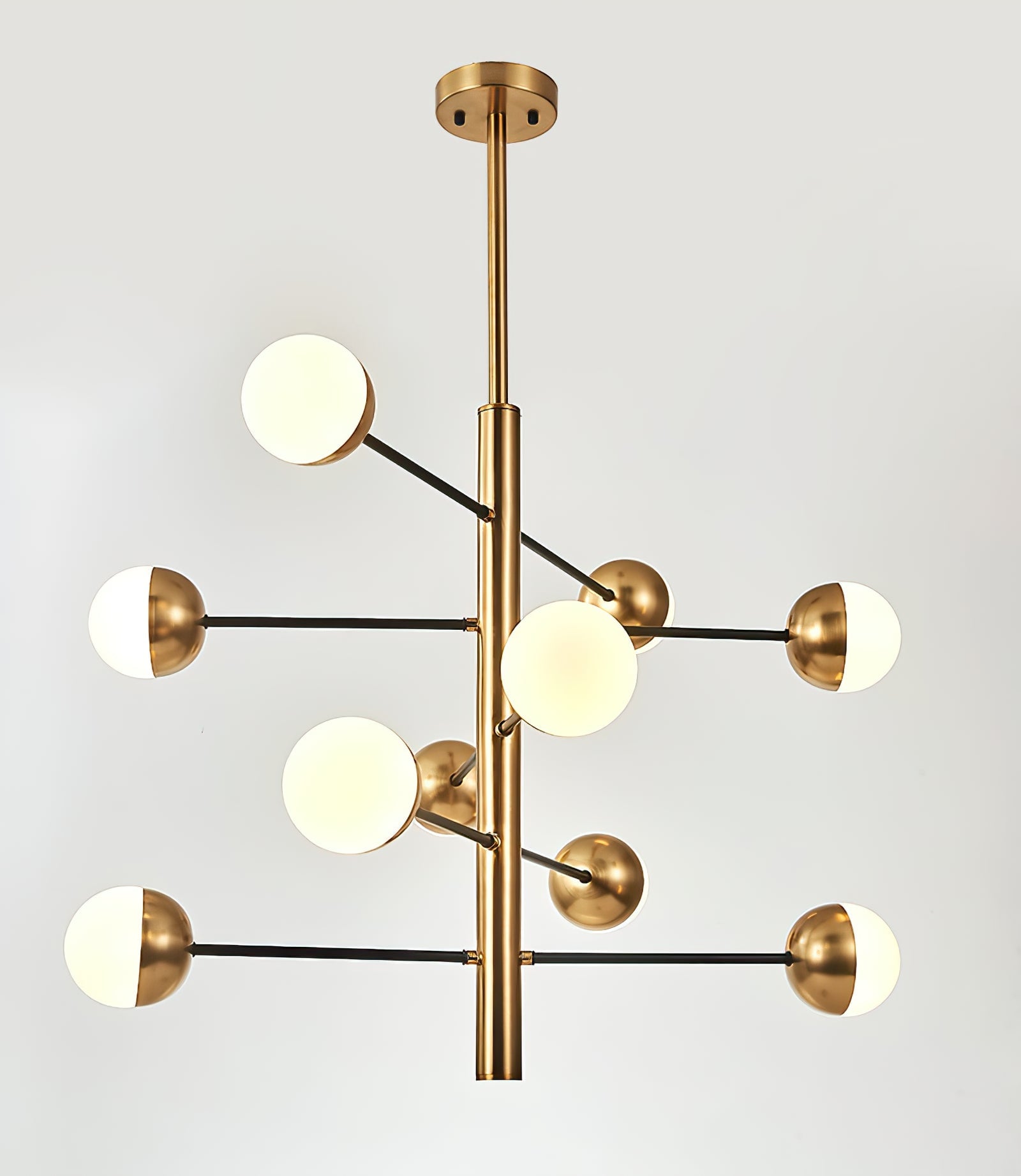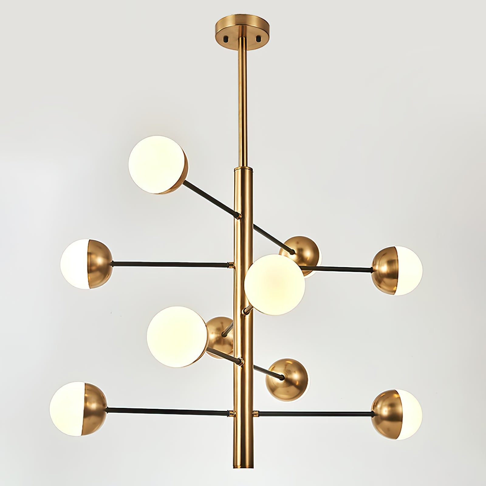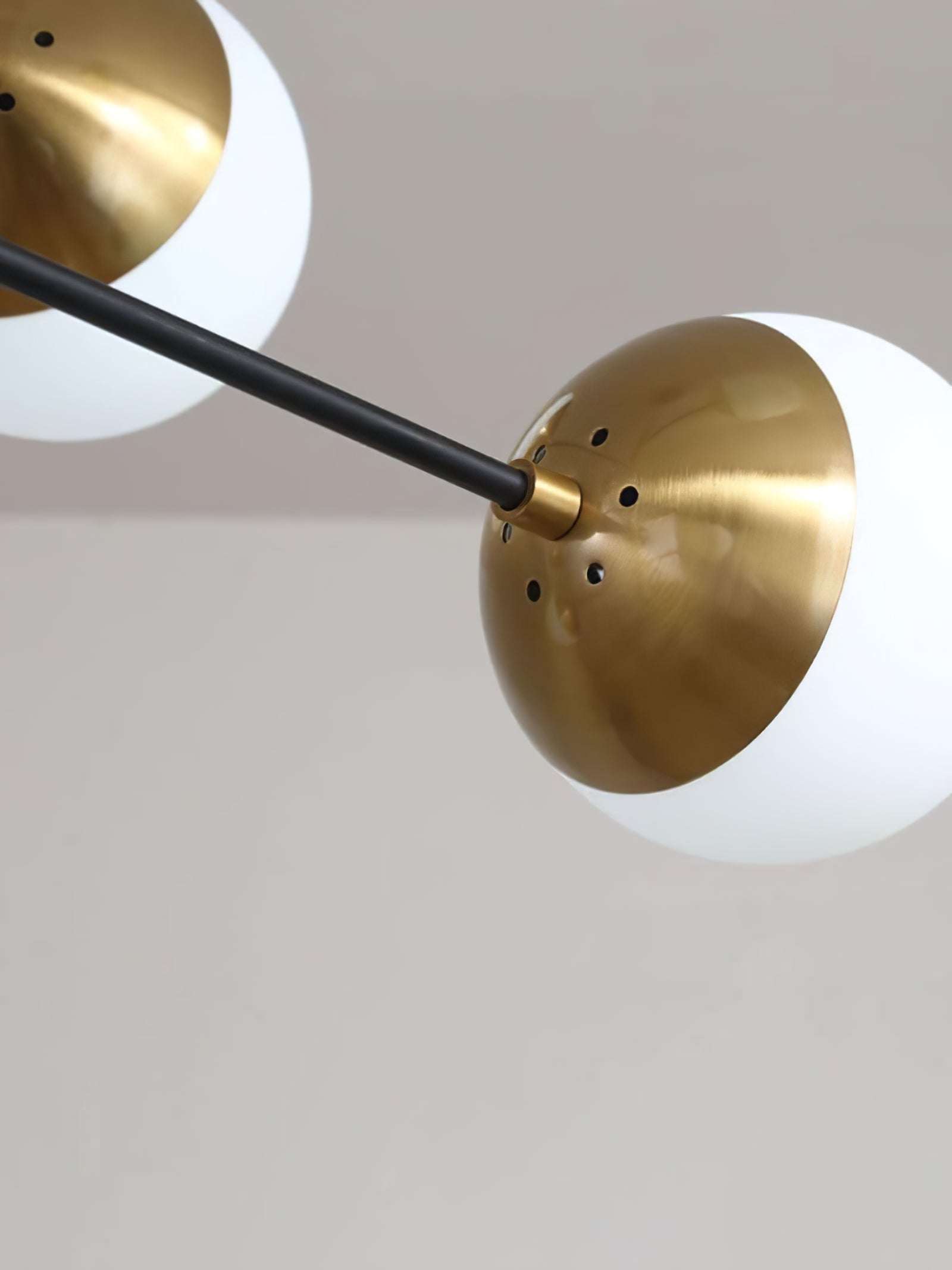 Die 10-Globe Moderne Messing-Deckenleuchte zeichnet sich durch ein elegantes Messing-Finish aus, das einen luxuriösen, aber dennoch zurückhaltenden Look verleiht. Der Globus-Schirm ist in zwei Teile unterteilt, wobei eine Hälfte mit opakem Messing bedeckt ist und die andere sanft diffuses Licht durchlässt, was einen ausgewogenen Lichteffekt erzeugt. Die klaren Linien und die geometrische Symmetrie der Lampe machen sie perfekt für zeitgenössische Innenräume, Esszimmer oder Wohnräume, die einen schlanken, modernen Akzent setzen möchten.