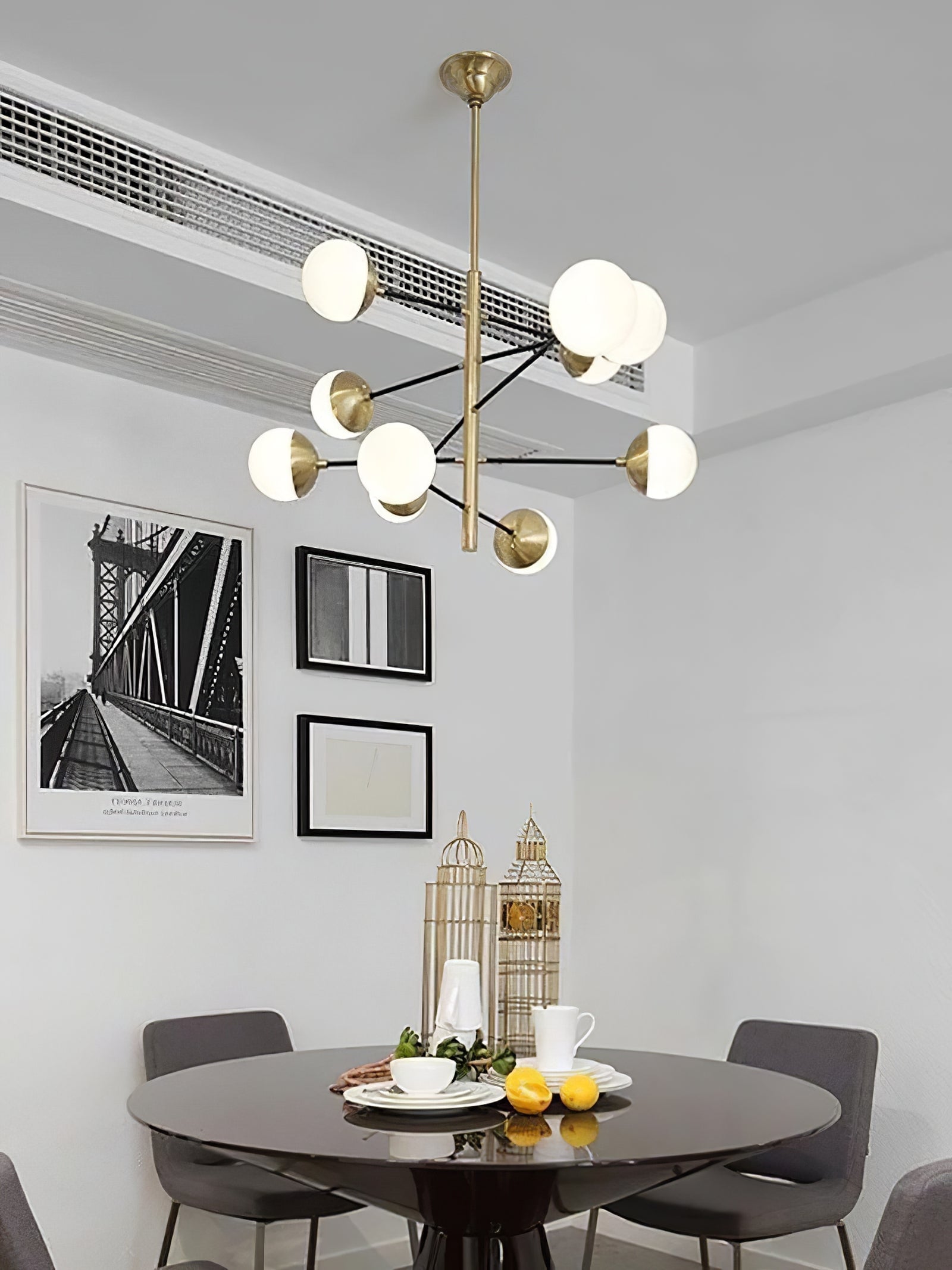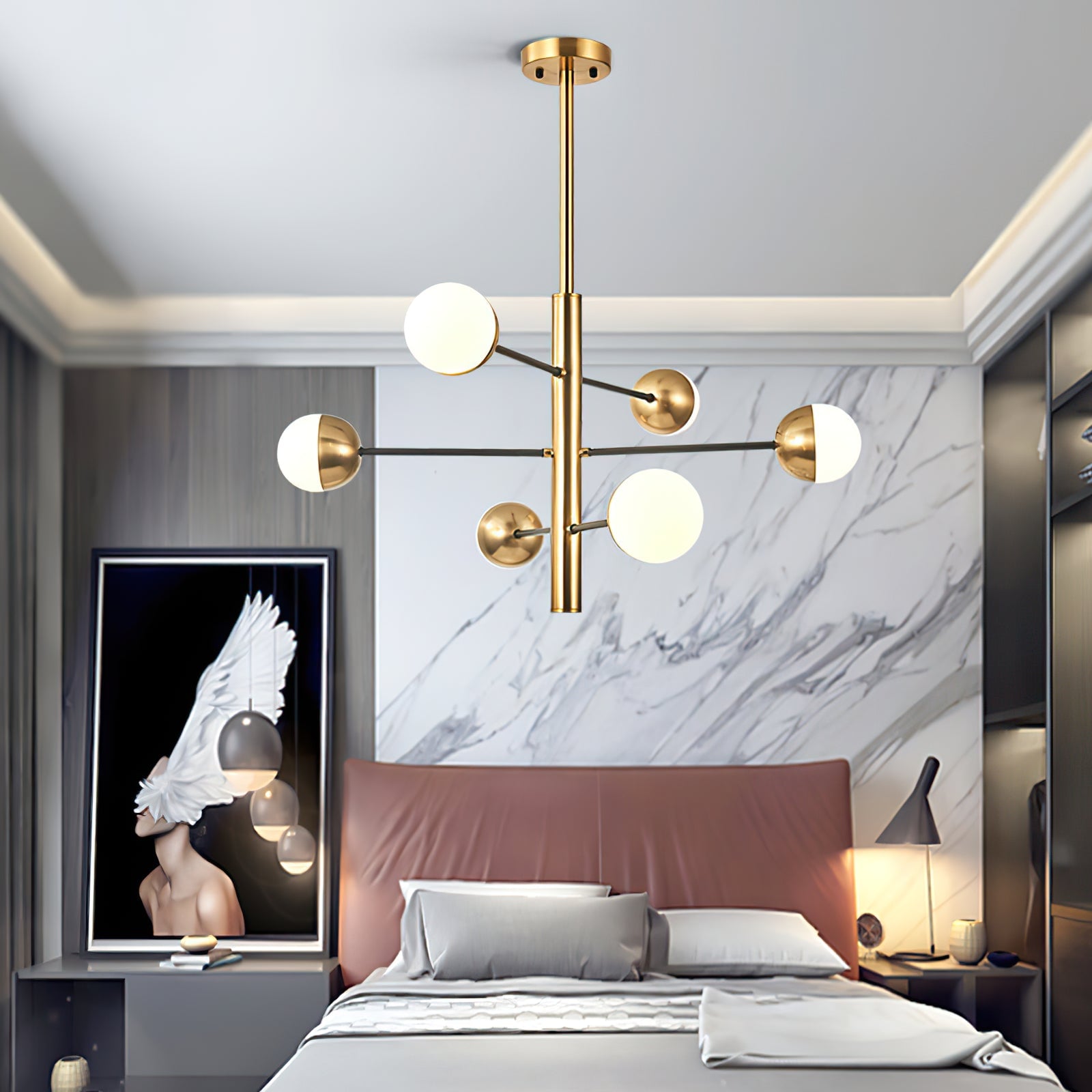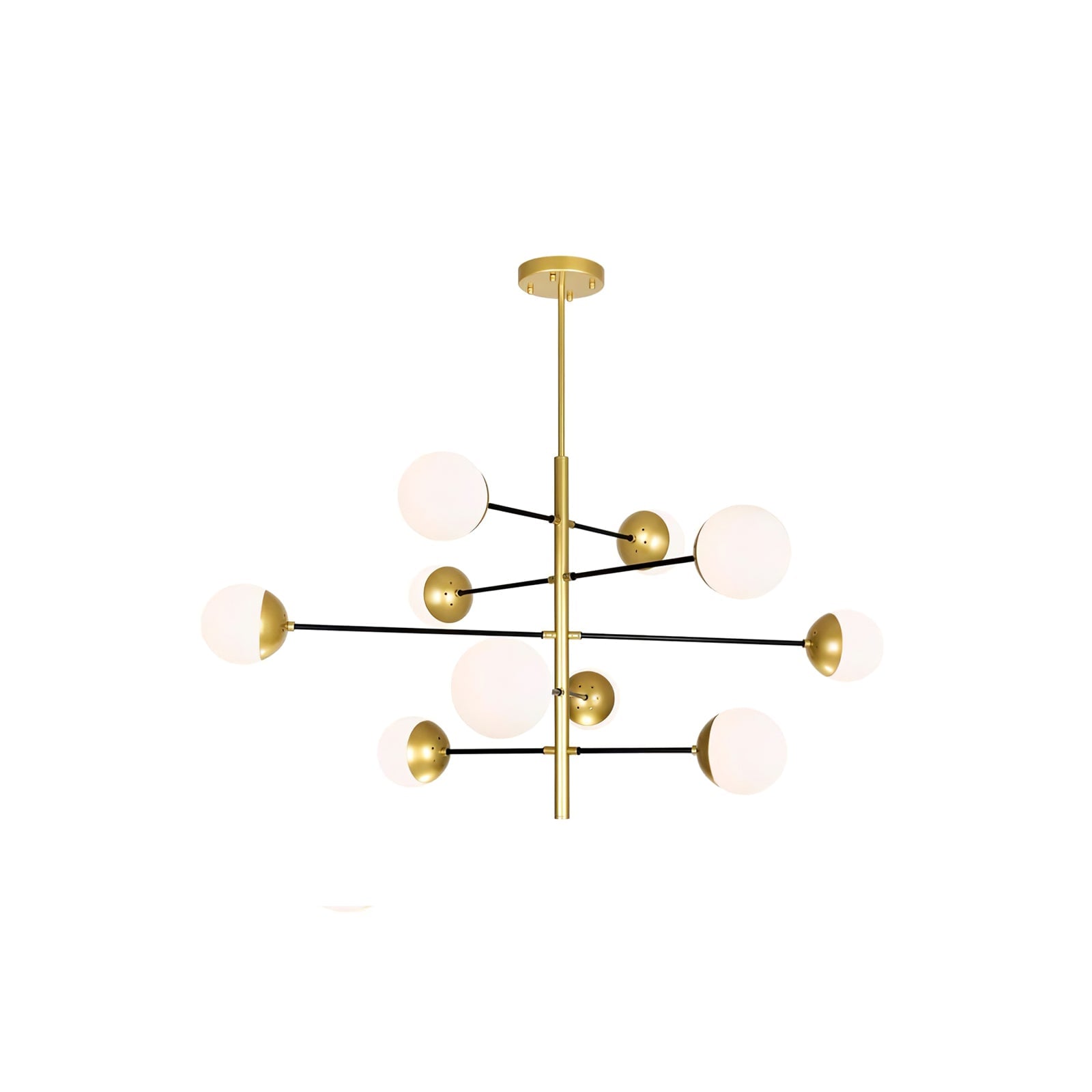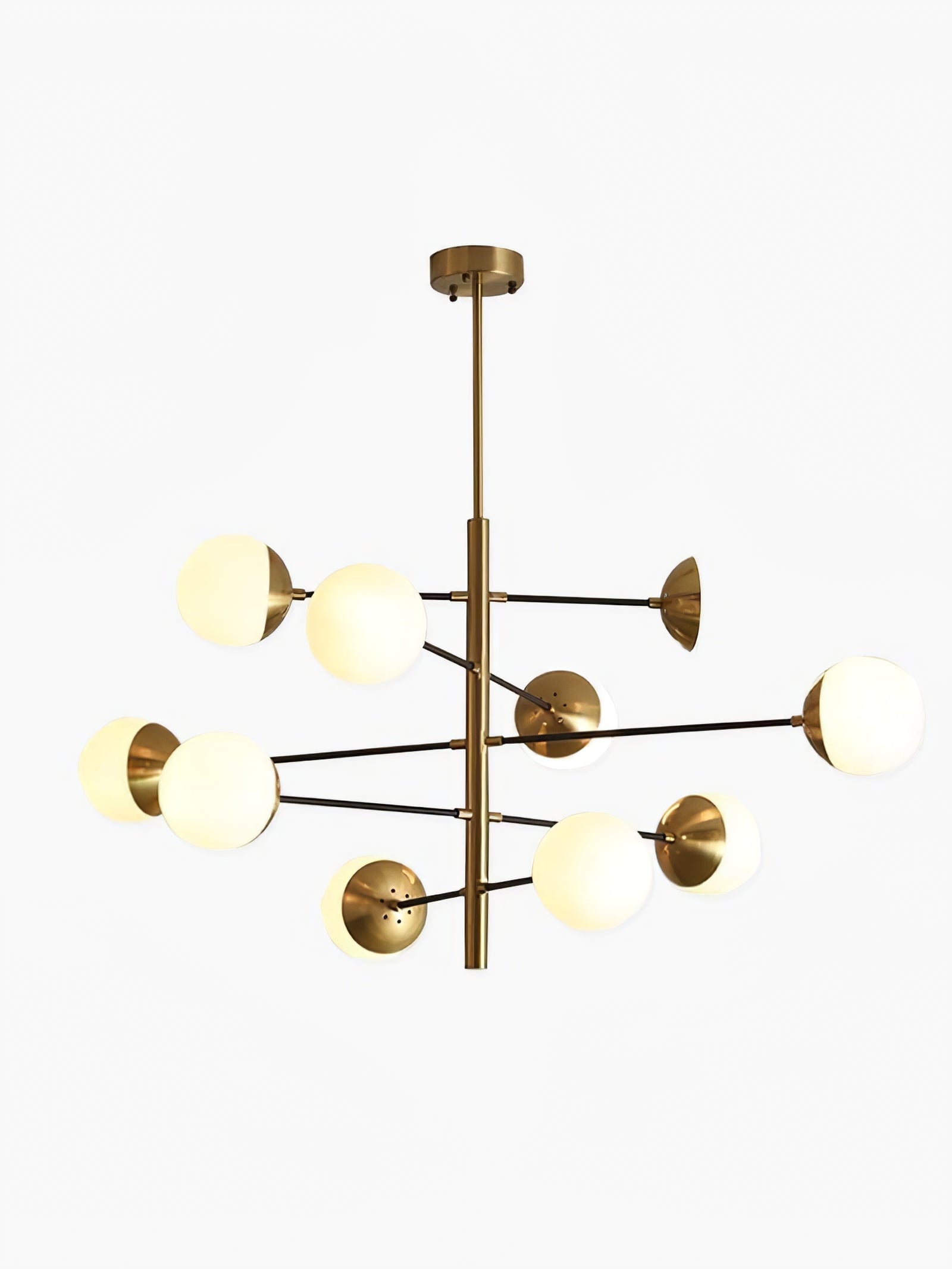 Die 10-Globe Moderne Messing-Deckenleuchte zeichnet sich durch ein elegantes Messing-Finish aus, das einen luxuriösen, aber dennoch zurückhaltenden Look verleiht. Der Globus-Schirm ist in zwei Teile unterteilt, wobei eine Hälfte mit opakem Messing bedeckt ist und die andere sanft diffuses Licht durchlässt, was einen ausgewogenen Lichteffekt erzeugt. Die klaren Linien und die geometrische Symmetrie der Lampe machen sie perfekt für zeitgenössische Innenräume, Esszimmer oder Wohnräume, die einen schlanken, modernen Akzent setzen möchten.