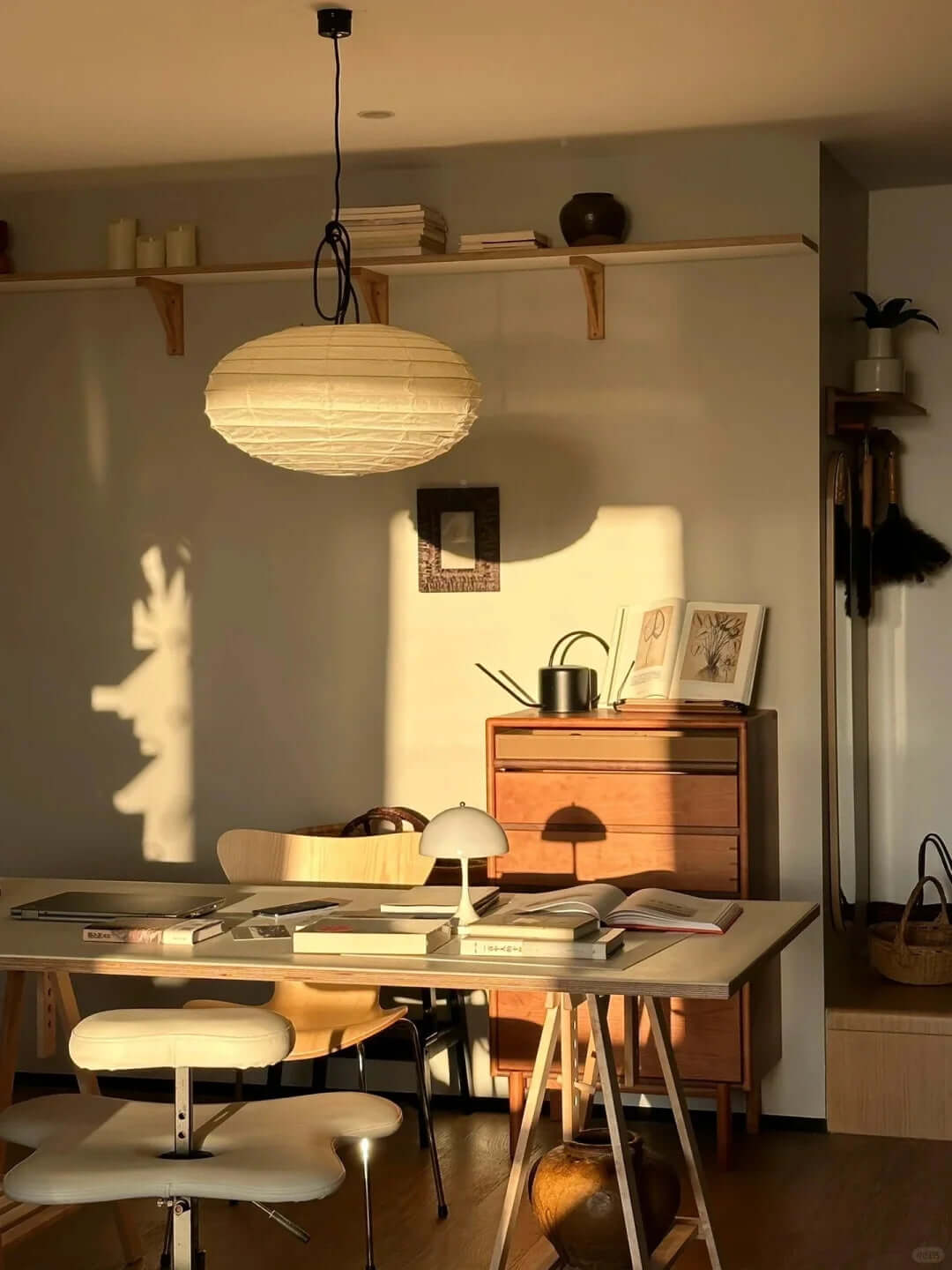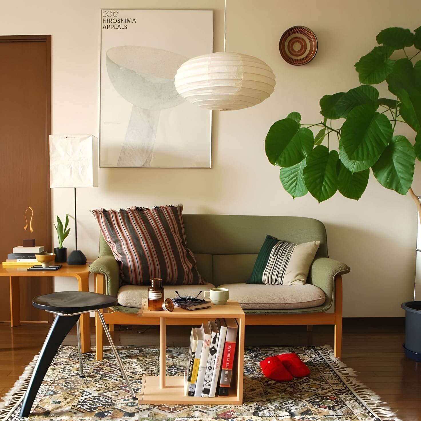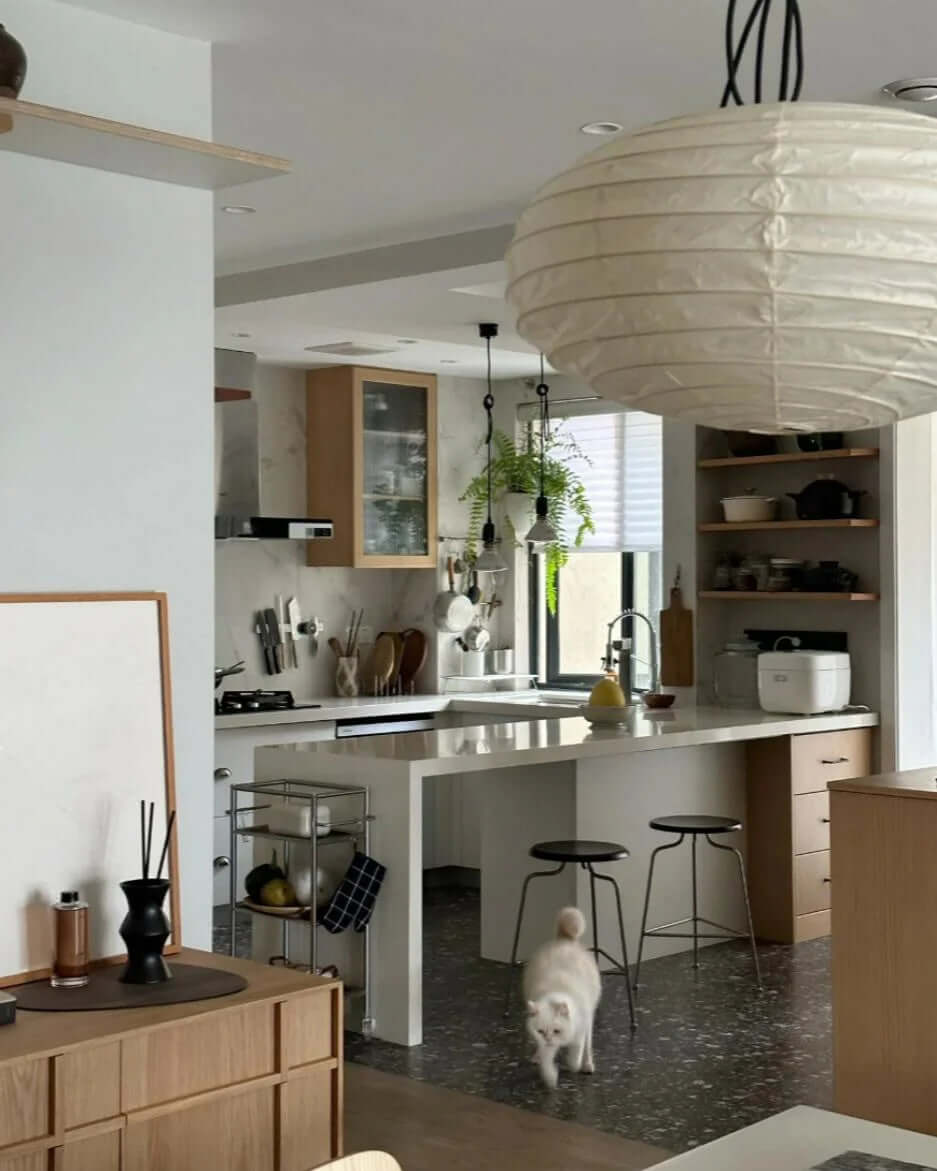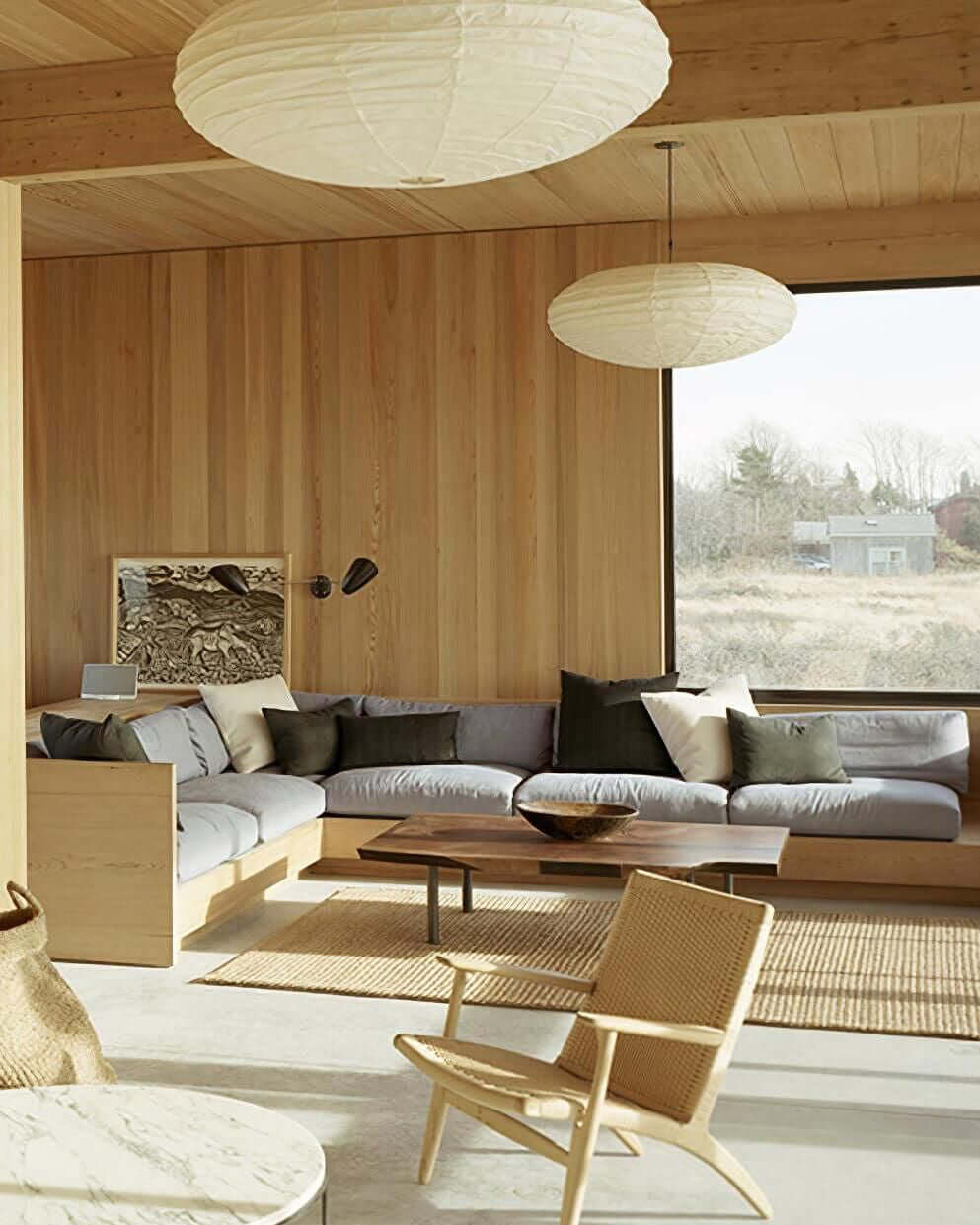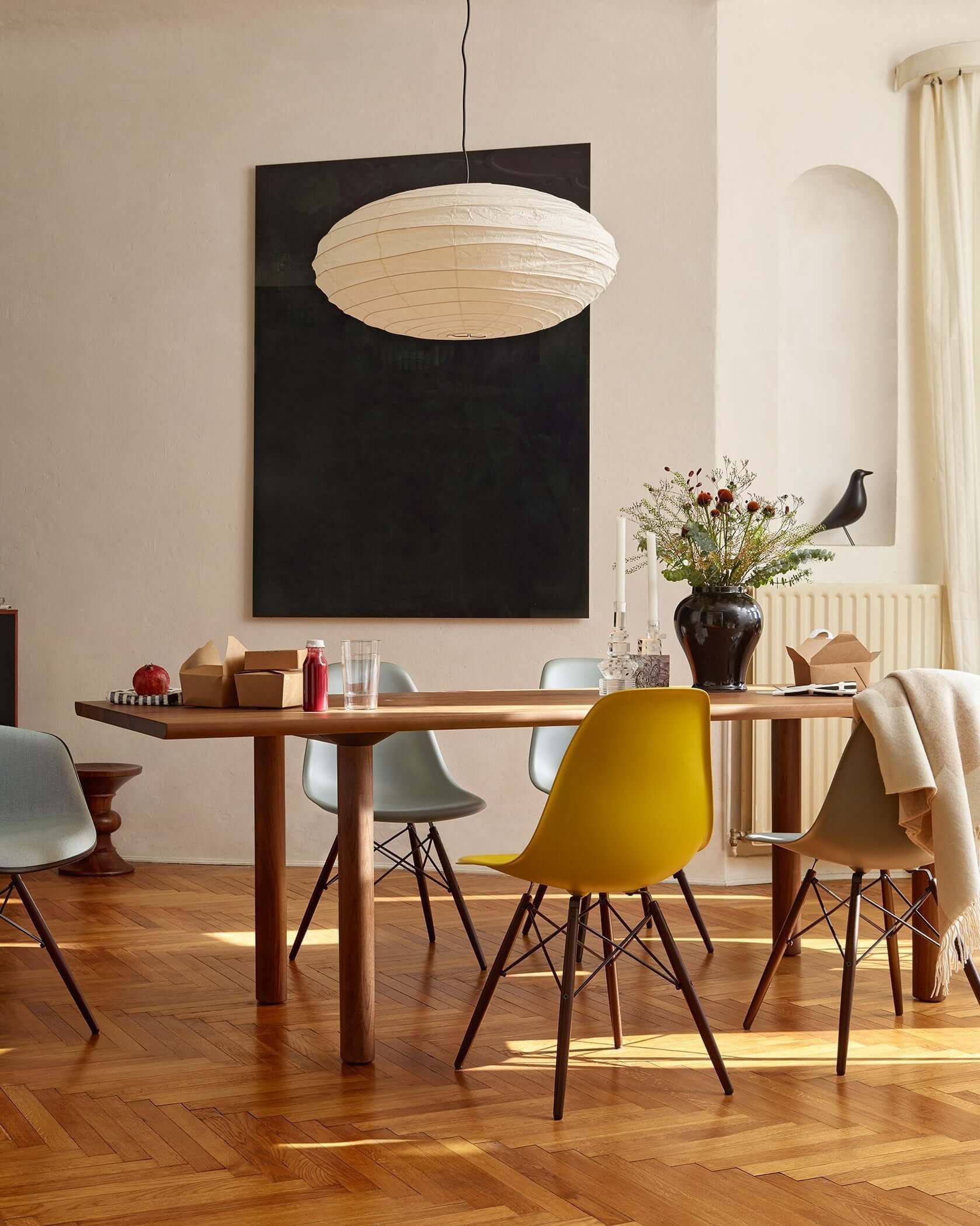 Die Akari-Leuchten sind handgefertigt aus Bambus-Rippen und transluzentem Washi-Papier, das aus der inneren Rinde des Maulbeerbaums hergestellt wird. Der Designer hat das Licht von Akari mit Sonnenlicht verglichen, das durch traditionelle Shōji-Papiertüren gefiltert wird – die Lichtskulpturen erzeugen einen warmen Schein und eine angenehme Atmosphäre. Laut dem Designer: "Alles, was Sie benötigen, um ein Zuhause zu beginnen, ist ein Raum, ein Tatami und Akari.”