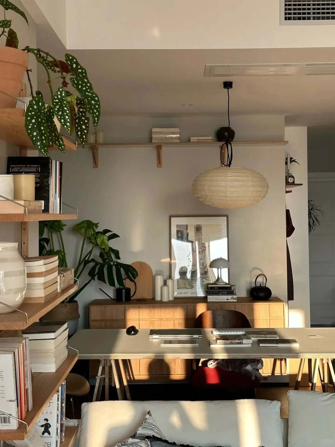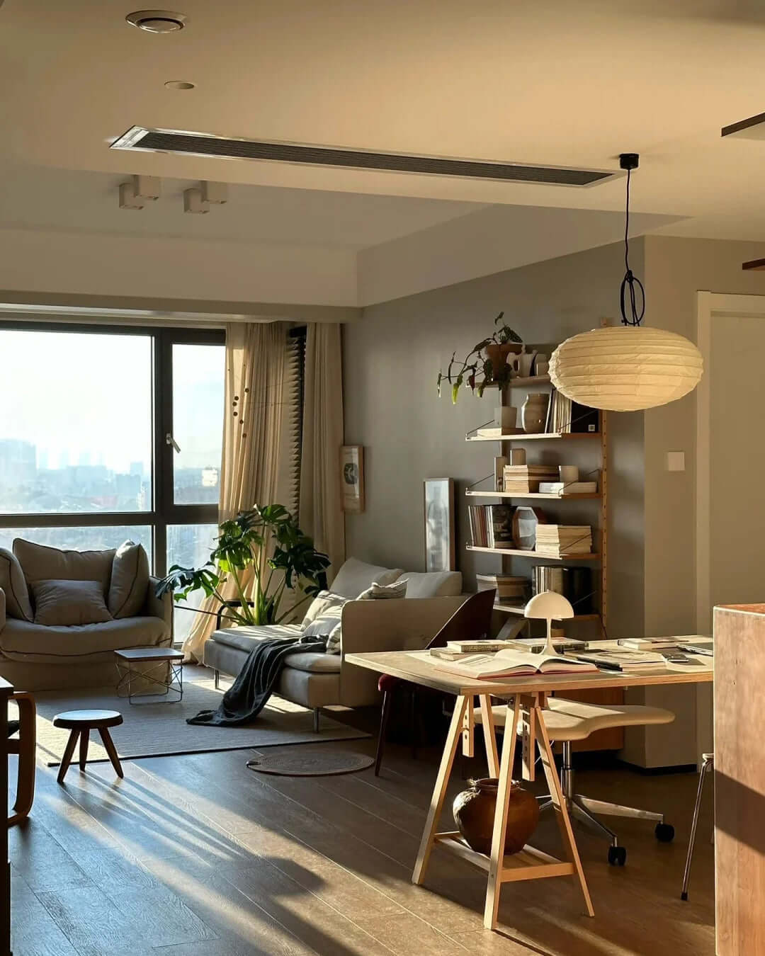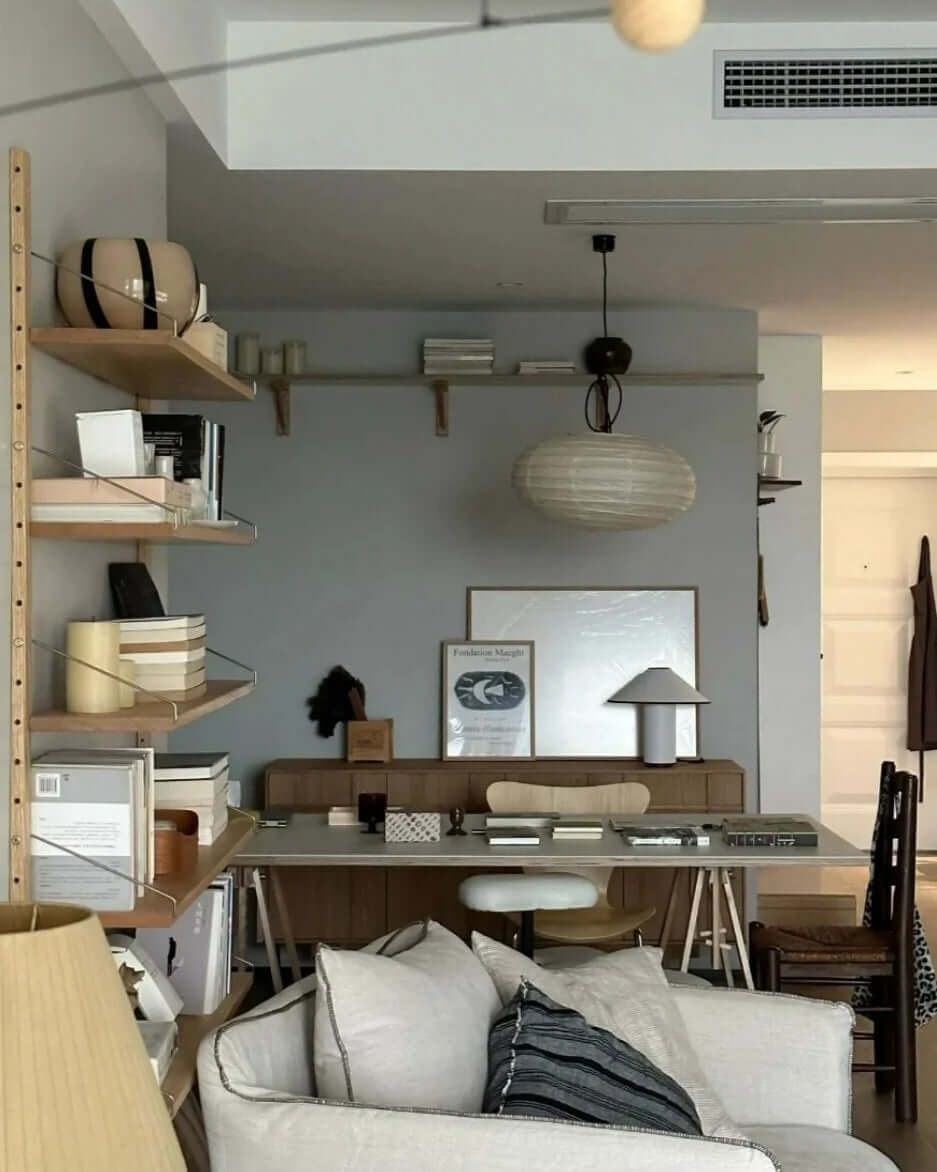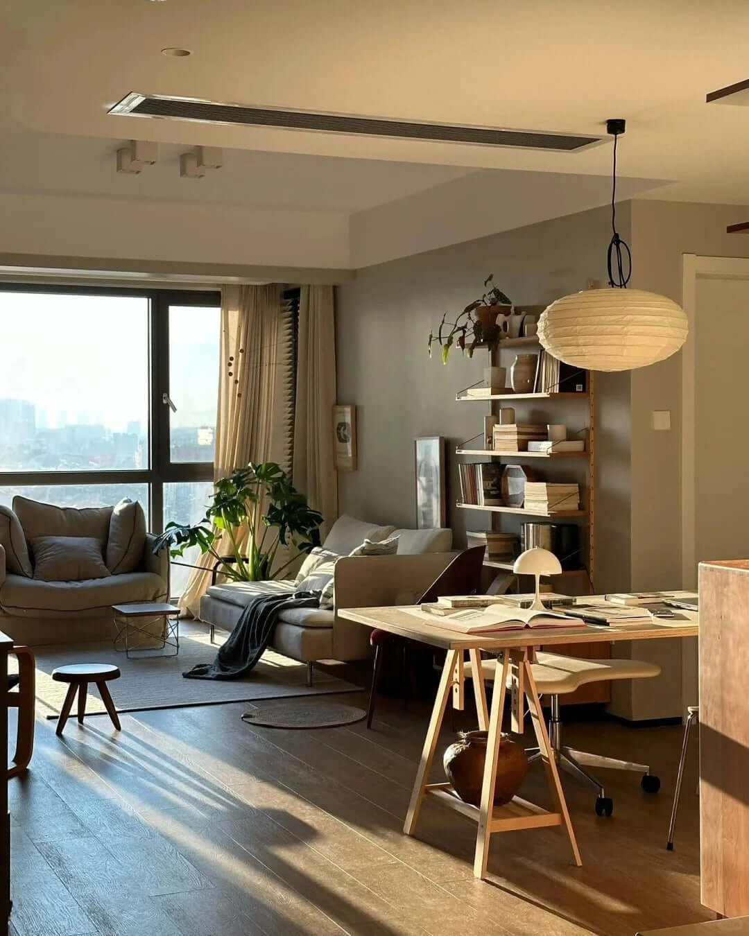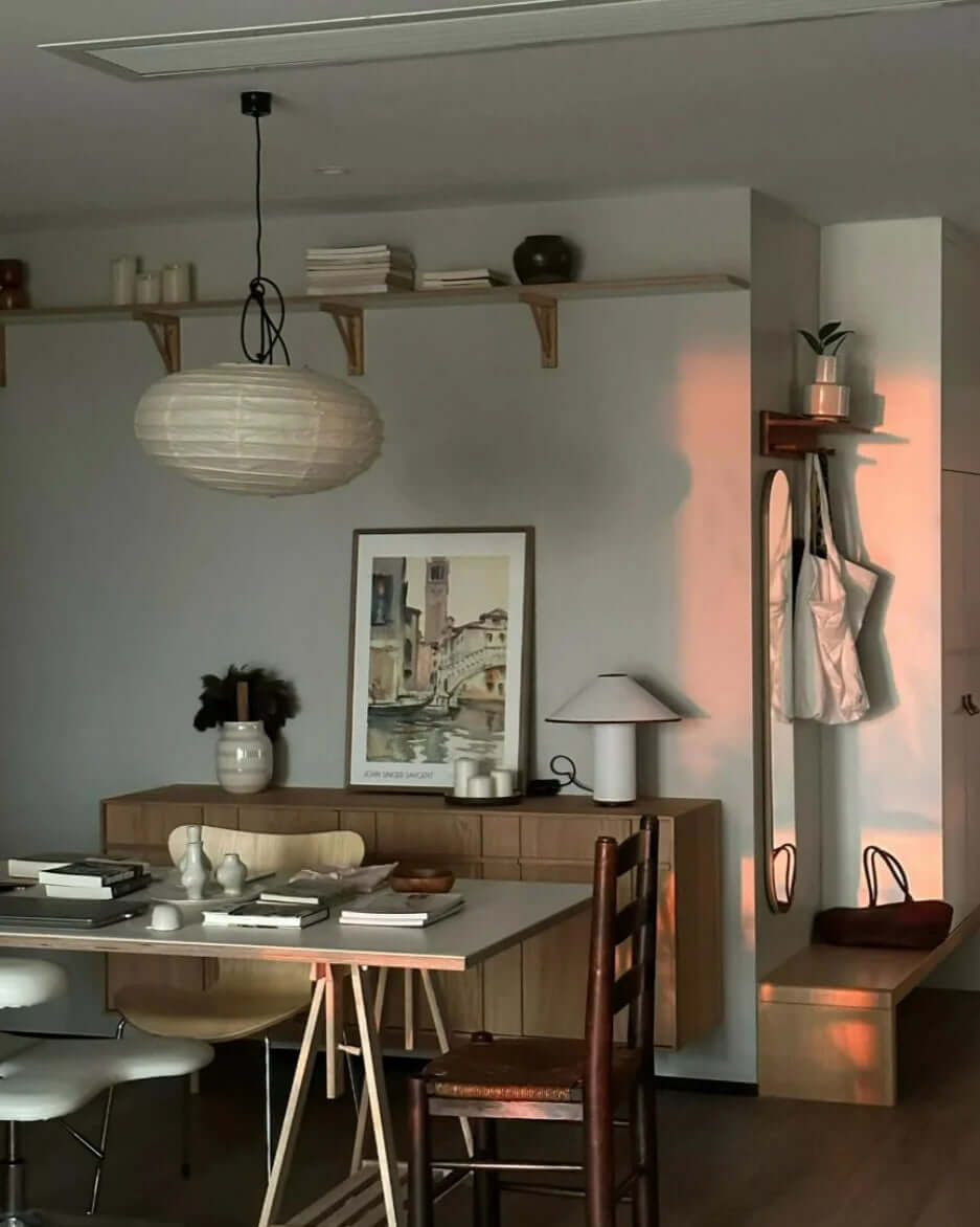 Die Akari-Leuchten sind handgefertigt aus Bambus-Rippen und transluzentem Washi-Papier, das aus der inneren Rinde des Maulbeerbaums hergestellt wird. Der Designer hat das Licht von Akari mit Sonnenlicht verglichen, das durch traditionelle Shōji-Papiertüren gefiltert wird – die Lichtskulpturen erzeugen einen warmen Schein und eine angenehme Atmosphäre. Laut dem Designer: "Alles, was Sie benötigen, um ein Zuhause zu beginnen, ist ein Raum, ein Tatami und Akari.”