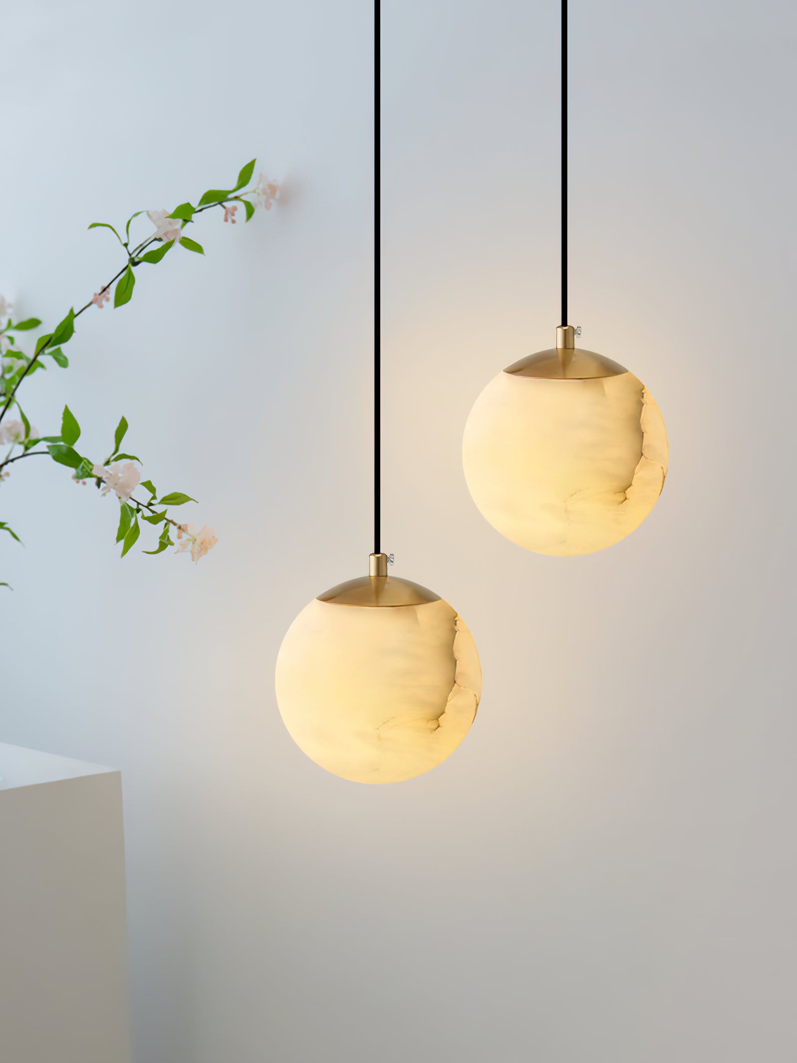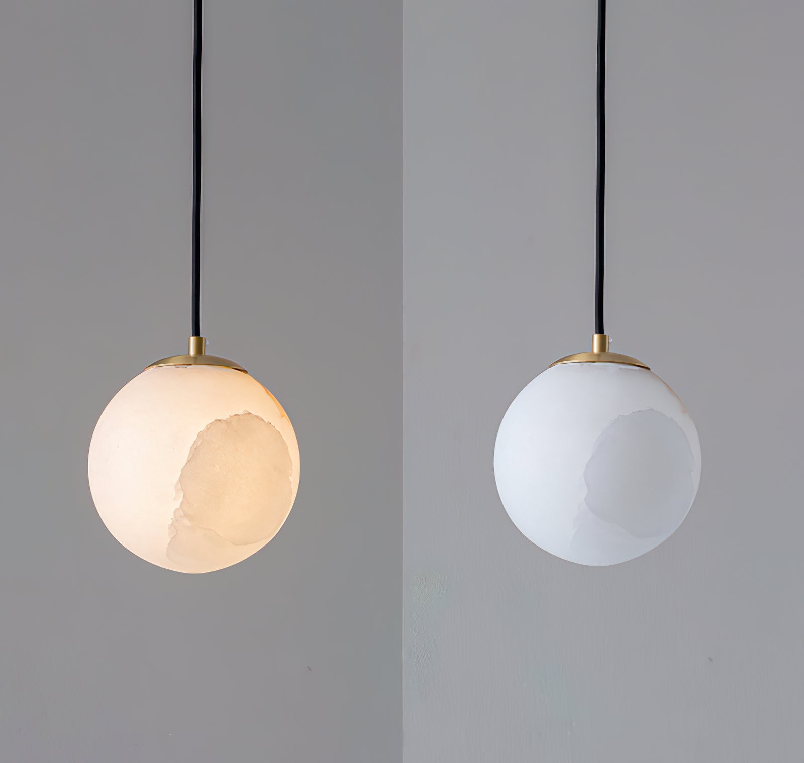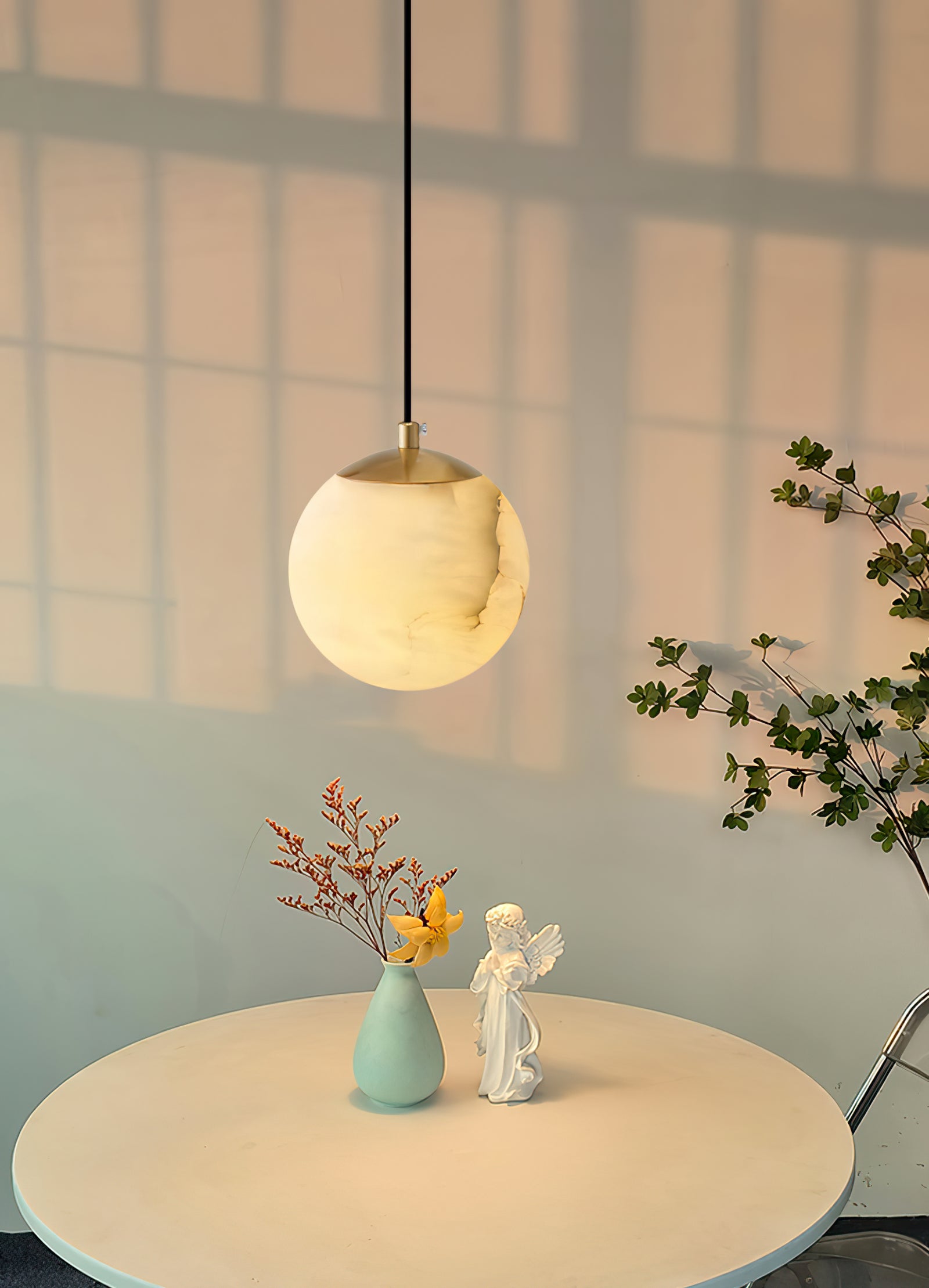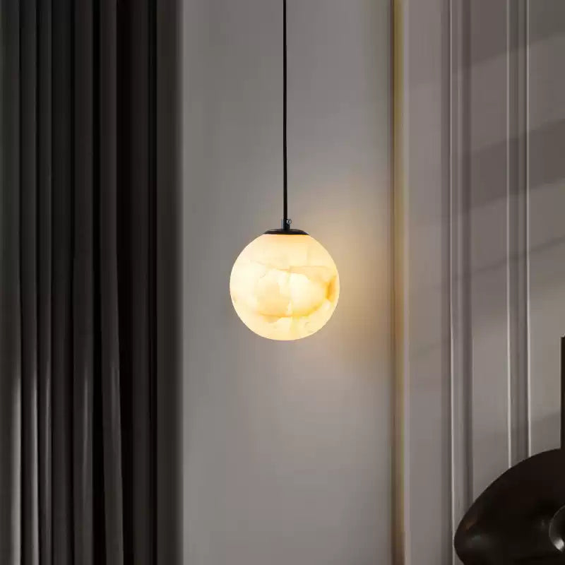 Die Amber-Alabaster-Globus-Hängelampe ist eine atemberaubende Fusion aus Eleganz und natürlicher Schönheit, die darauf ausgelegt ist, Wärme und Raffinesse in jeden Raum zu bringen. Die Pendelleuchte verfügt über einen runden Alabaster-Schirm mit wirbelnden bernsteinfarbenen Tönen, die die beruhigenden Nuancen eines Sonnenuntergangs hervorrufen. Wenn sie beleuchtet wird, strahlt der Globus ein sanftes, ambient Licht aus, das zarte Schatten wirft und die natürliche Maserung des Steins hervorhebt. Anmutig von einem minimalistischen Stiel hängend, ist diese Pendelleuchte perfekt für Schlafzimmer, Wohnzimmer oder jeden Raum, der eine ruhige, raffinierte Atmosphäre sucht. Ihre einzigartige Textur und der warme Schein verleihen modernen oder klassischen Innenräumen einen künstlerischen Akzent.