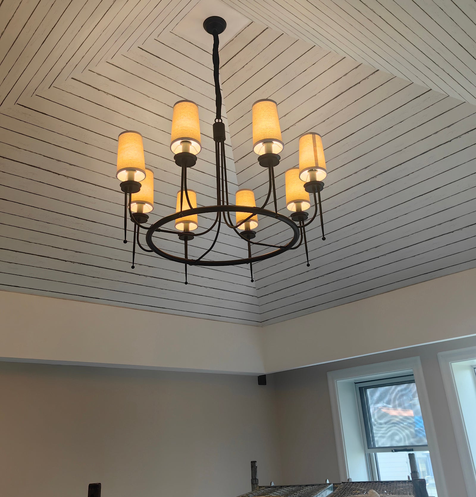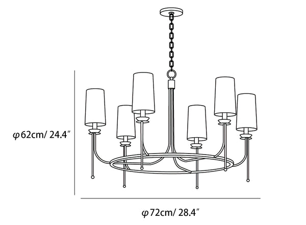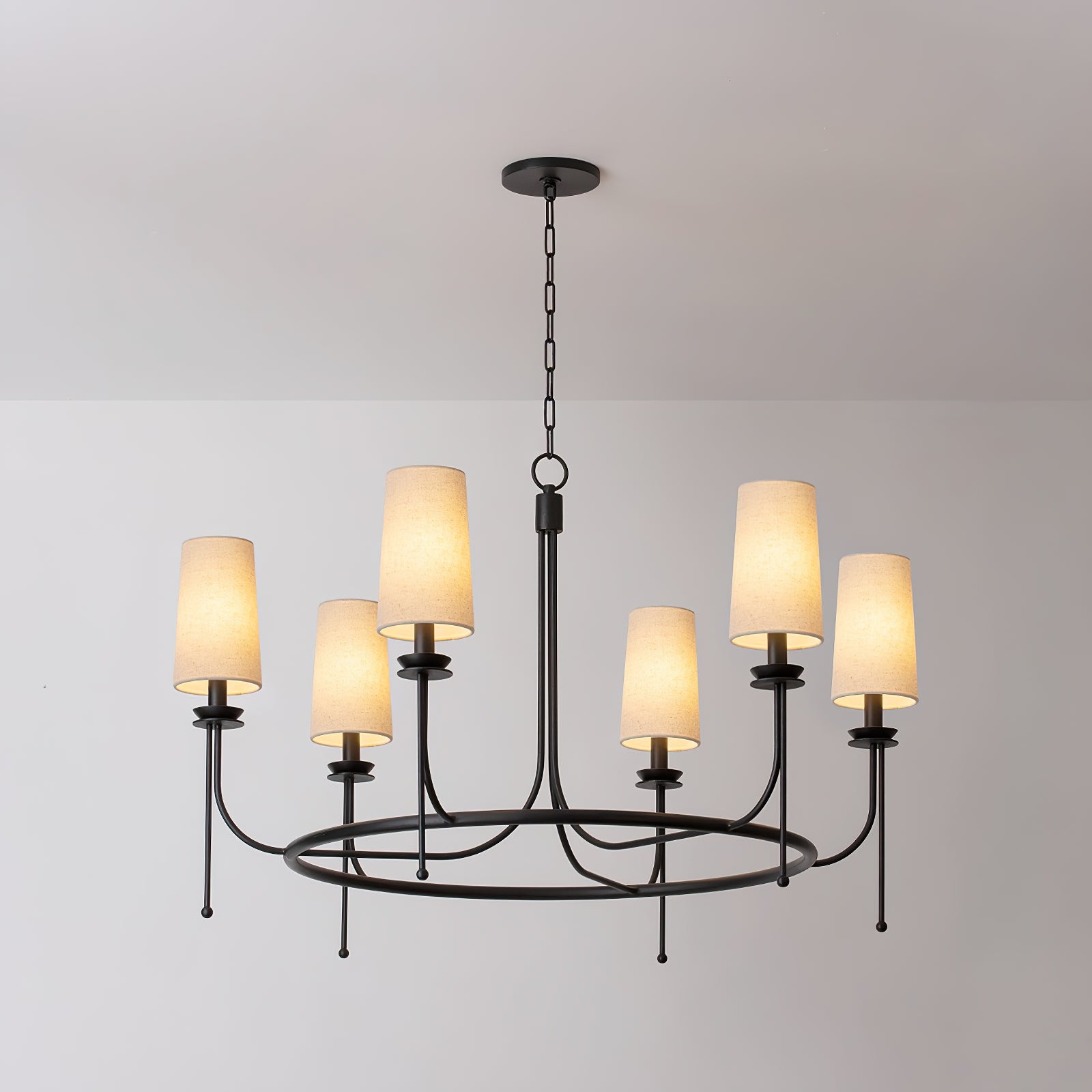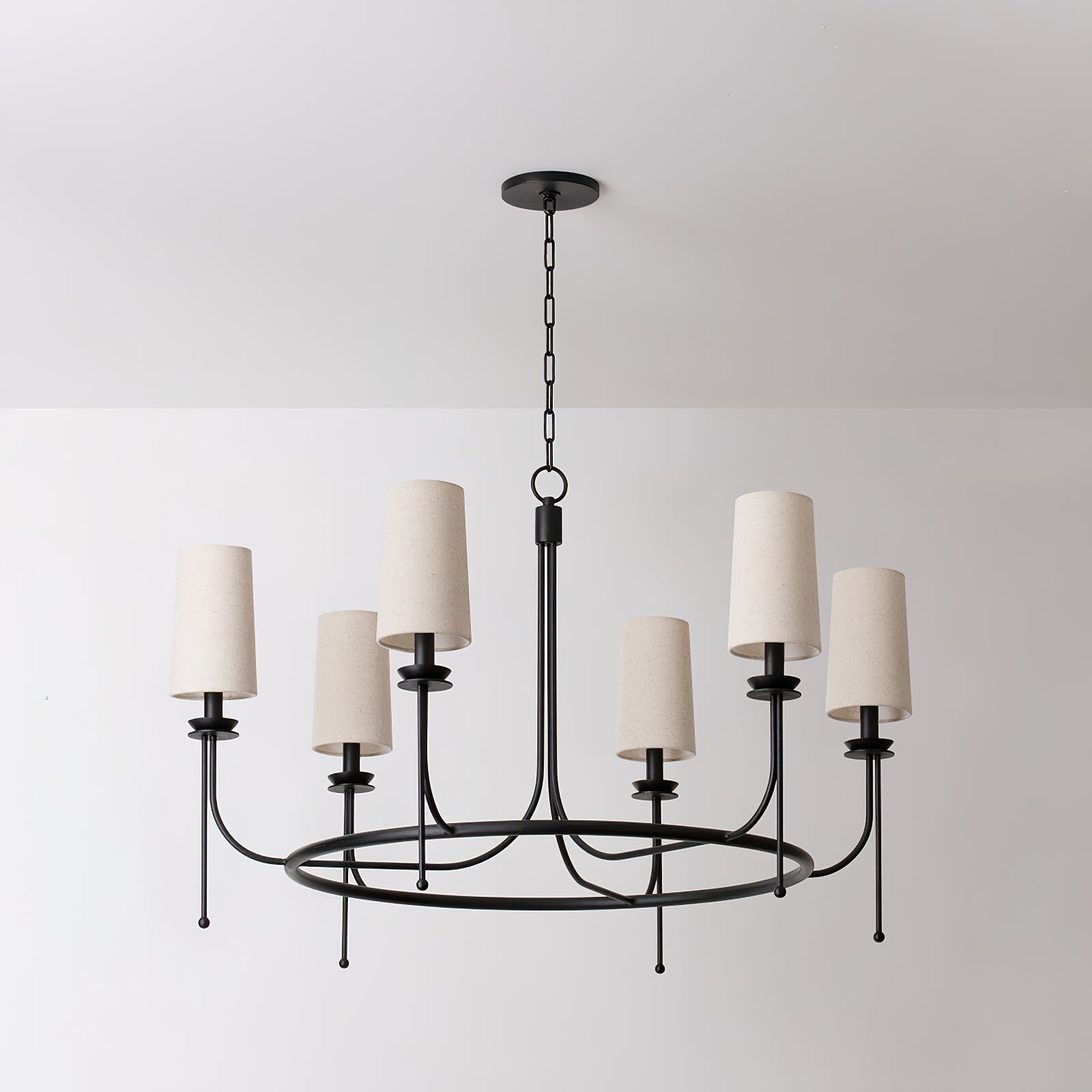 Striking yet streamlined in design, the Calder Chandelier is a classic addition to your dining room or living room. The elegant ring structure and extended tails are made from forged iron and feature natural linen shades.