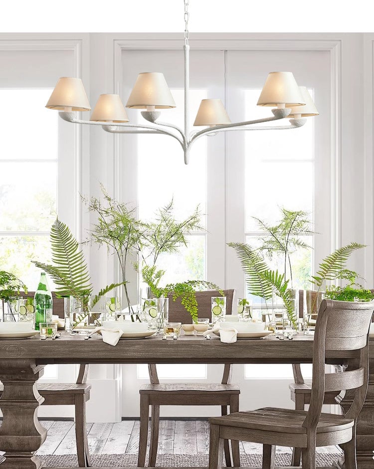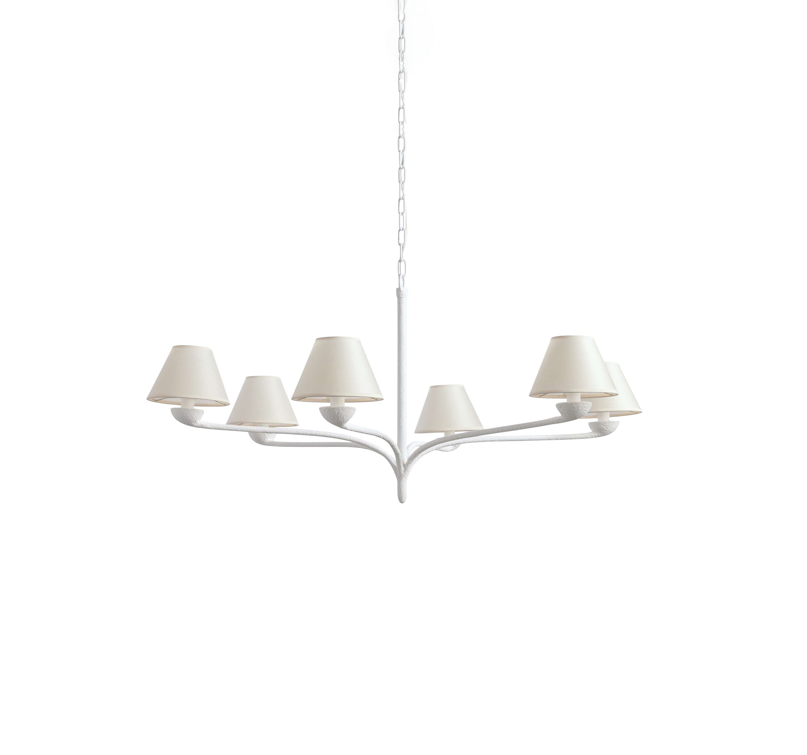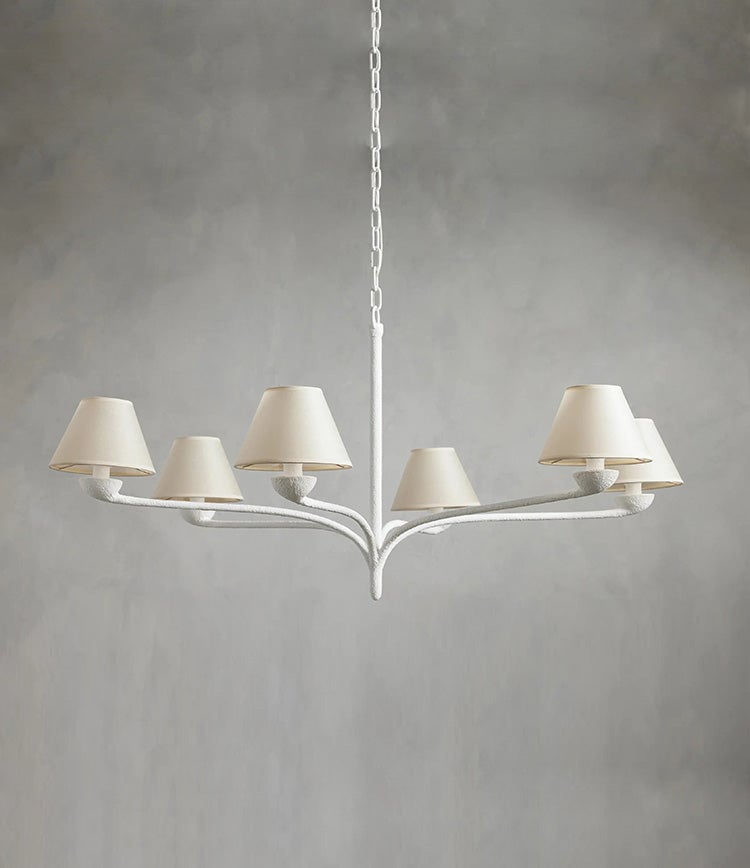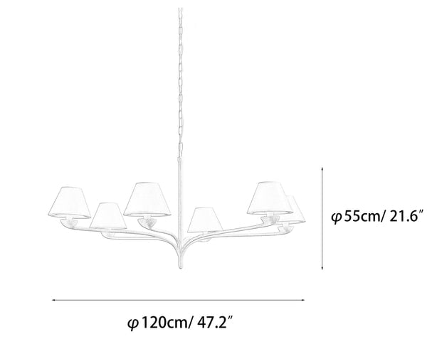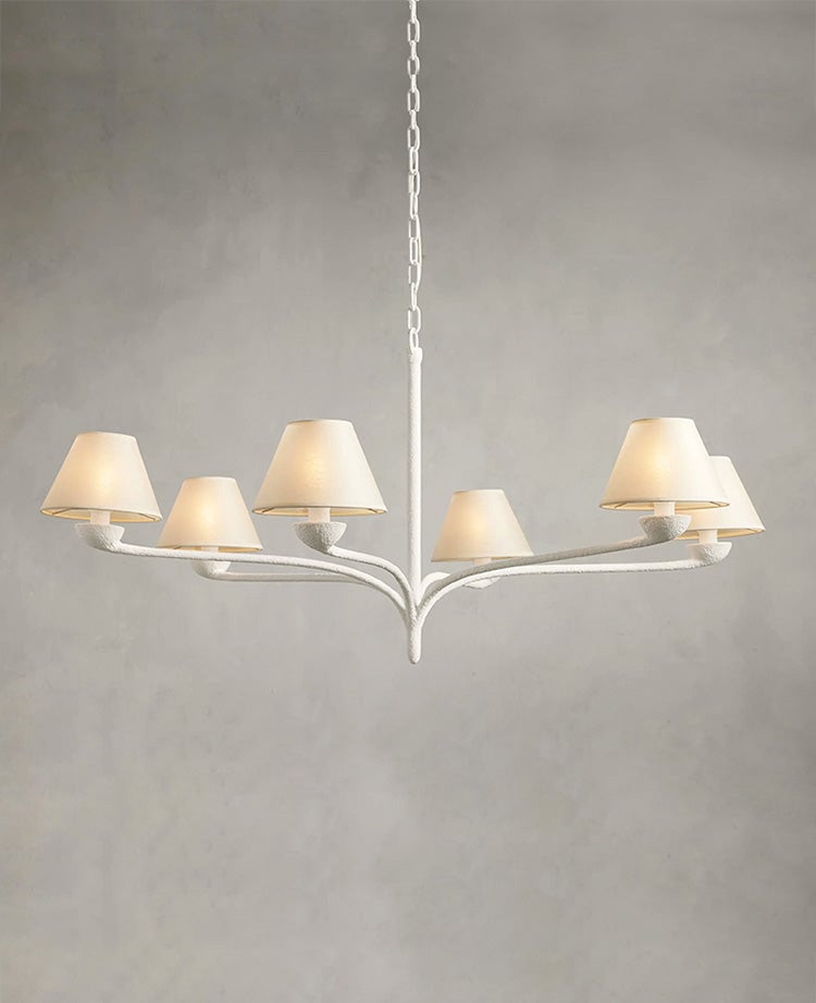 Der Dorsey Rund 6-Licht Kronleuchter präsentiert ein einfaches und modernes Design, das zu einer Vielzahl von Einrichtungsstilen passt. Sein runder Metallrahmen umschließt elegant sechs Lampenhalter, von denen jeder mit einem zarten Lampenschirm versehen ist, was einen stilvollen und geschichteten Look erzeugt. Die polierte Textur des Metallrahmens ergänzt das sanfte Licht des Lampenschirms und bringt einen warmen Halo sowie eine gemütliche Atmosphäre in den Raum.
