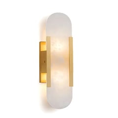 Die Geometric Harmony Alabaster Wandleuchte vereint mühelos natürlichen Alabaster und elegante Metallakzente in einer schlanken geometrischen Form und strahlt eine moderne Raffinesse aus, während sie die Schönheit des Natursteins betont. Diese Wandlampe verfügt über handgefertigten natürlichen Alabaster mit Messingdetails.