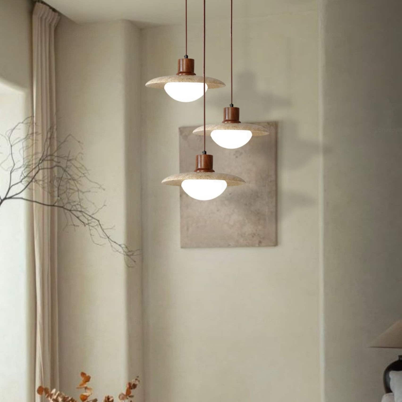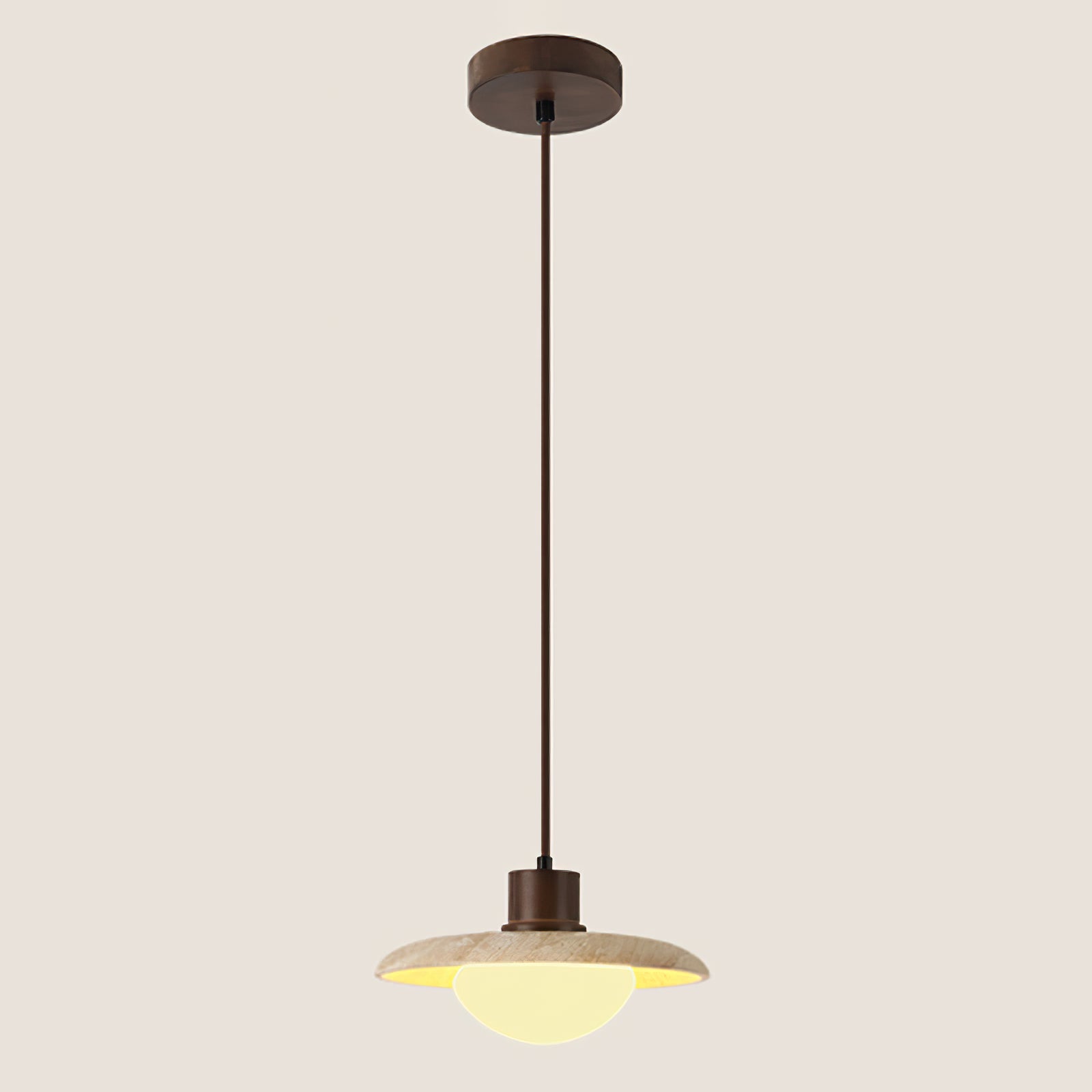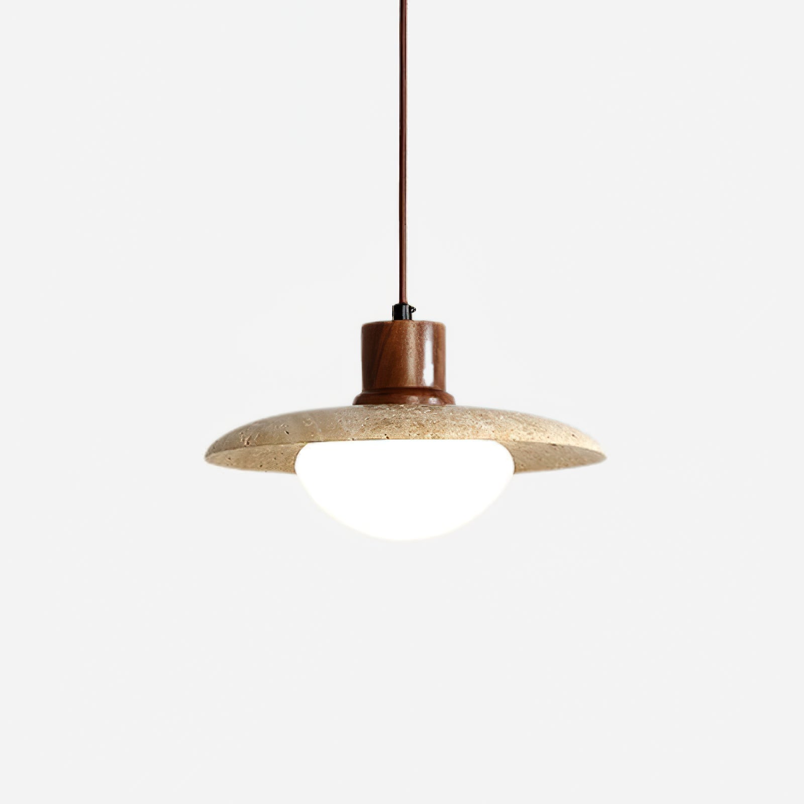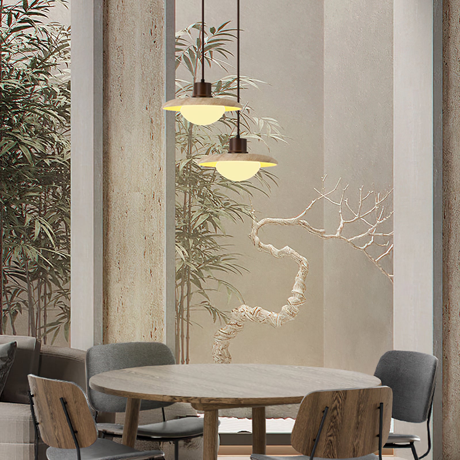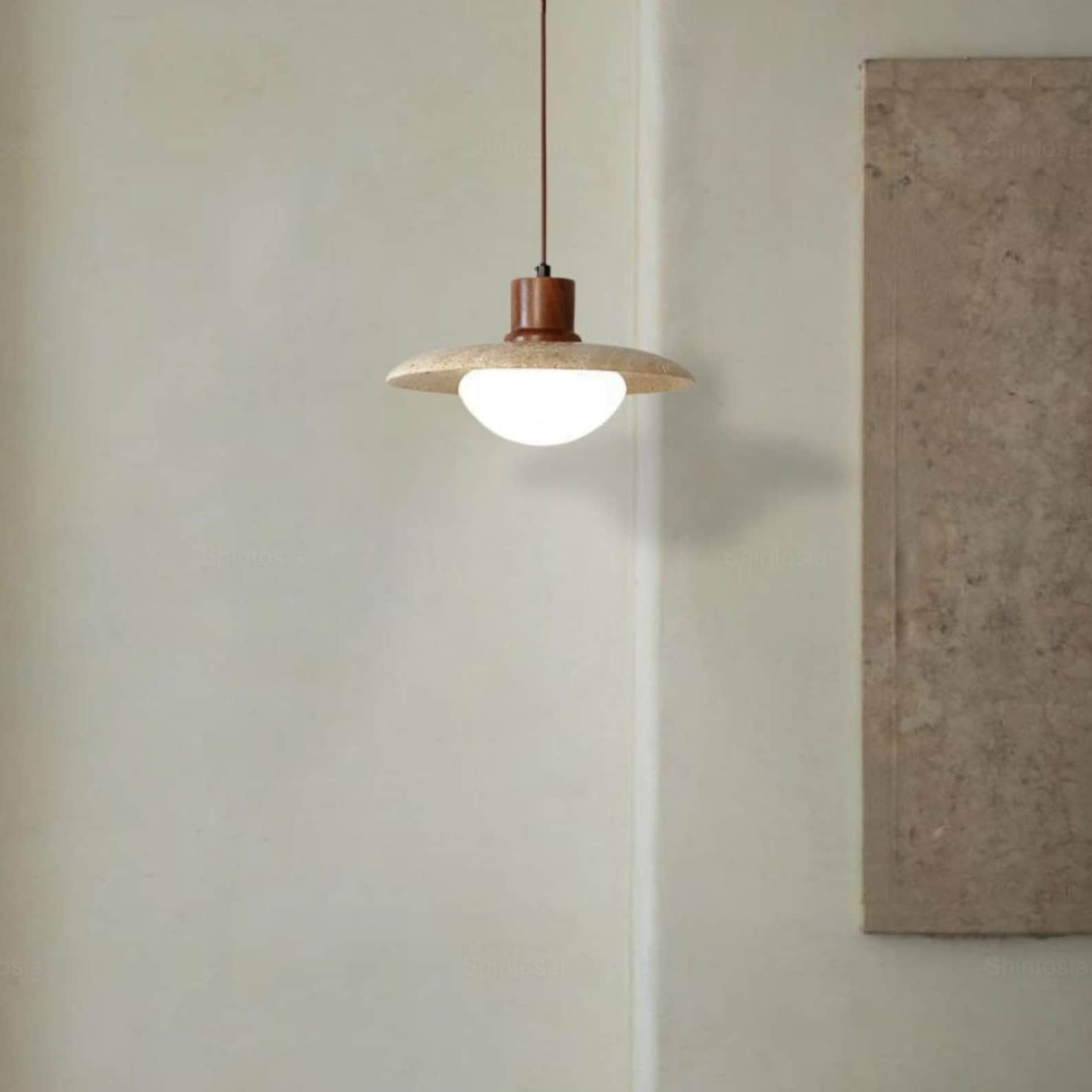 Die japanische moderne Travertin-Hängelampe vereint minimalistisches Design mit natürlicher Eleganz, inspiriert von der japanischen Ästhetik. Ihre breite Travertin-Scheibe dient als Schirm und weist erdige Texturen auf, die wunderschön mit dem glatten, runden Glasdiffusor darunter kontrastieren. Diese Pendelleuchte sorgt für ein warmes, sanftes Licht, das perfekt ist, um eine beruhigende Atmosphäre in Wohnräumen, Essbereichen oder Arbeitszimmern zu schaffen. Die einzigartige Kombination aus Naturstein und eleganten Designelementen macht sie zu einem Blickfang für moderne Innenräume, die Einfachheit und natürliche Schönheit schätzen.