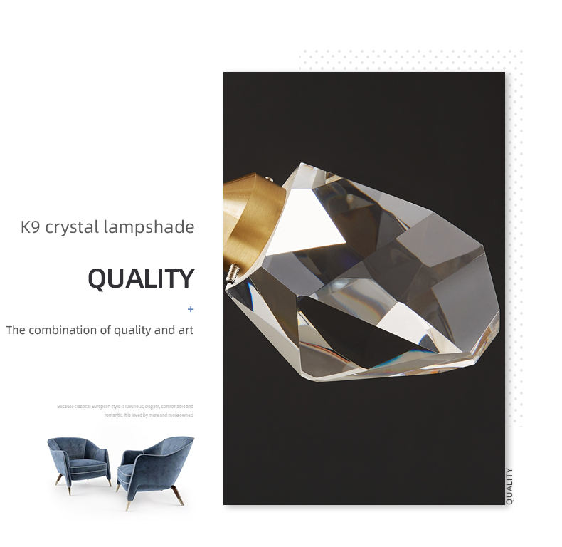 - Dieser Kronleuchter verfügt über Kristallschirme mit einer einzigartigen unregelmäßigen Form. Jeder Kristall ist sorgfältig aus mehreren Winkeln geschnitten, um die Lichtdurchlässigkeit zu maximieren, was zu einem reinen und transparenten Strahlen führt, das Ihren Raum in ein faszinierendes Licht taucht. Die einzigartige Form fügt eine künstlerische Dimension hinzu und macht ihn zu mehr als nur einem Beleuchtungselement; er ist ein Kunstwerk, das das Auge fängt.
