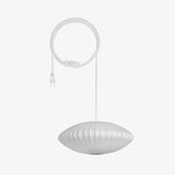 Der elegante Lampenschirm ist auf einem Stahlfuß montiert, der mit oder ohne eine Walnussabdeckung erhältlich ist, und verfügt über eine benutzerfreundliche An/Aus-Zugkette mit einem soliden Walnussende. Die Lampe beinhaltet auch ein 86-Zoll-Netzkabel. Die Nelson Bubble Lamps wurden erstmals 1952 entworfen, als Nelson von einer Reihe schwedischer Hängeleuchten inspiriert wurde. Ihr hoher Preis veranlasste Nelson dazu, sein eigenes Set zu kreieren, und er entwickelte einen innovativen Prozess, der den Seidenlampenschirm durch ein translucentes Kunststoffmaterial ersetzte, wodurch sie zu einem moderaten Preis erhältlich wurden.