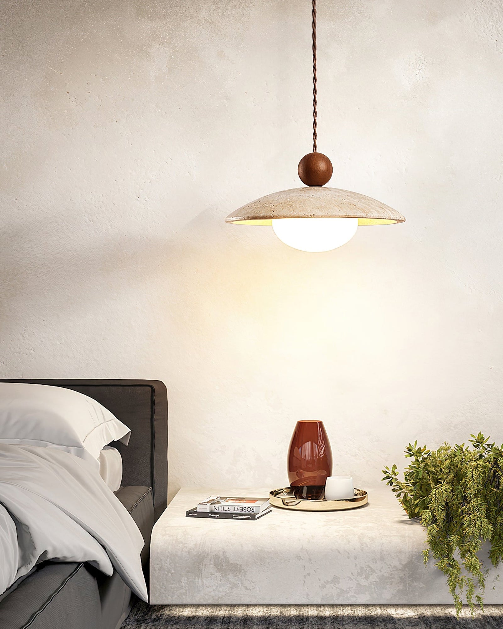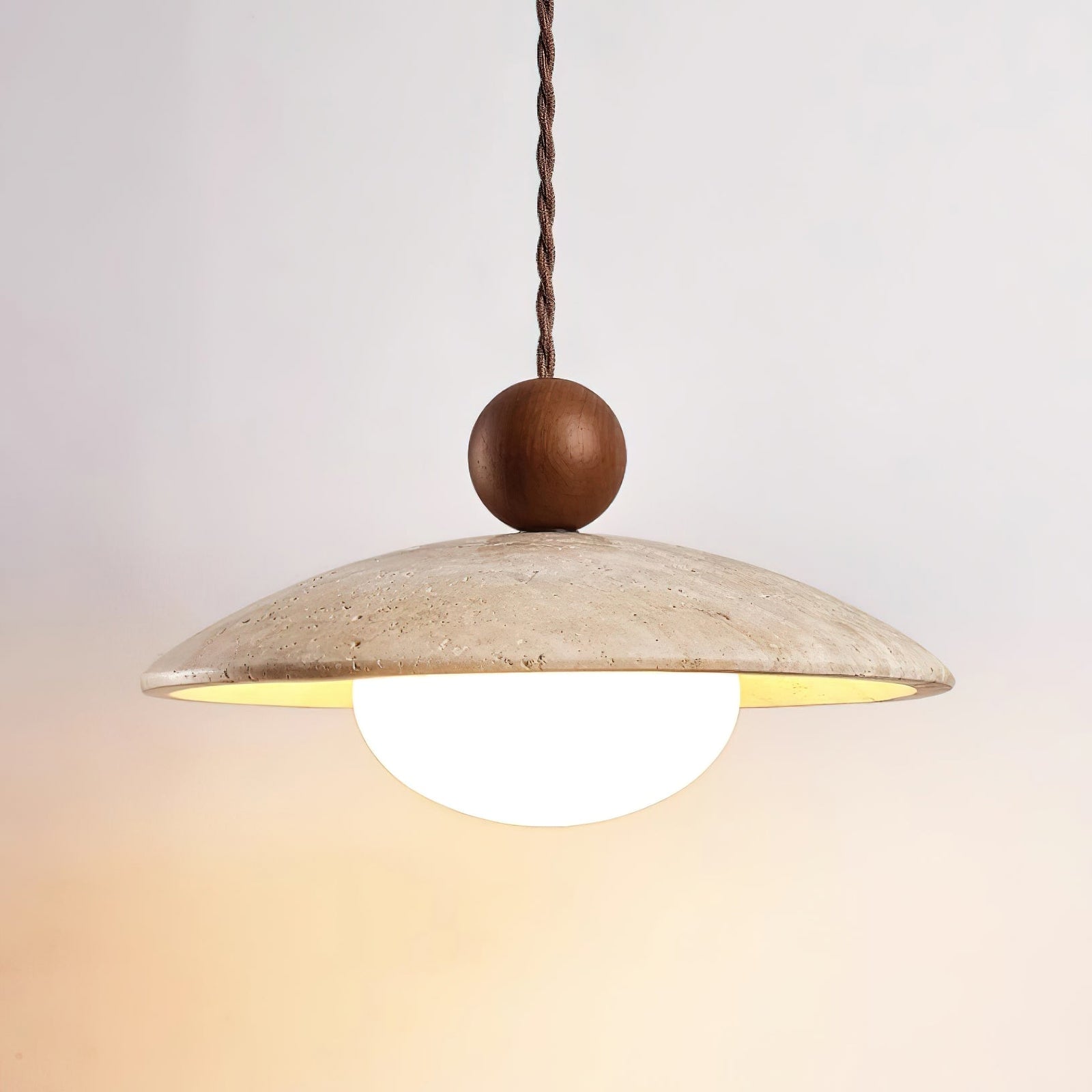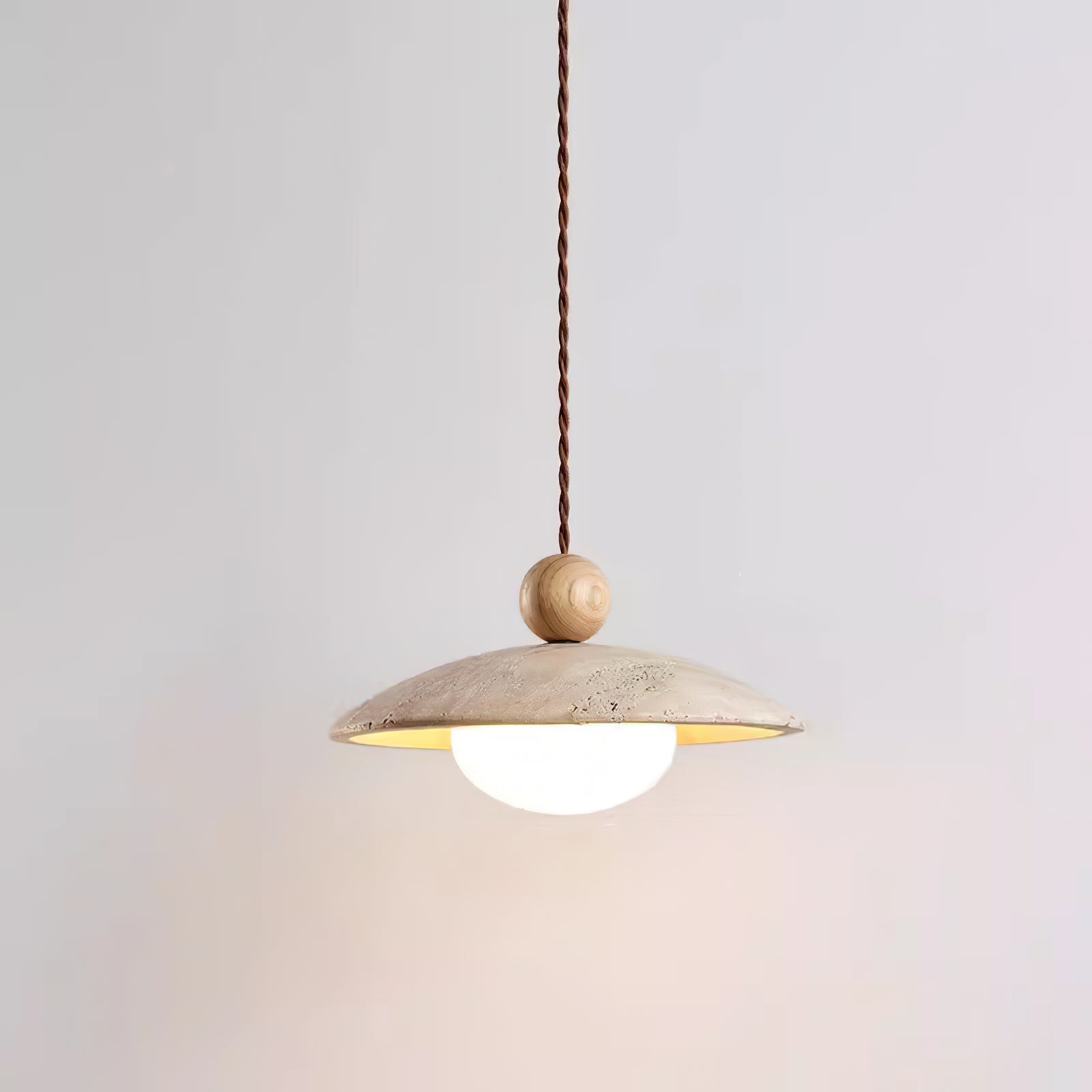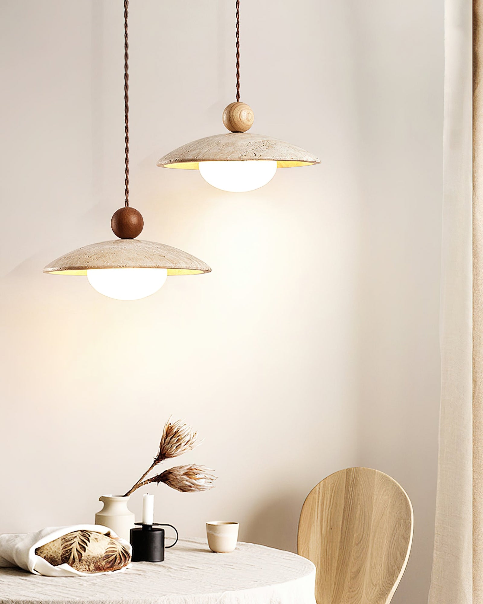 Die skandinavische Travertin-Disk-Pendelleuchte fängt das Wesen minimalistischer Schönheit und nachhaltiger Handwerkskunst ein. Hergestellt aus natürlich gewonnenem Holz und robustem Travertin, feiert diese Lampe die einzigartigen Texturen jedes Materials. Die glatte Holzsphäre kontrastiert harmonisch mit dem erdigen, strukturierten Travertinschirm und schafft eine ausgewogene, organische Ästhetik. Diese Pendelleuchte strahlt ein sanftes, beruhigendes Licht aus und ist eine perfekte Ergänzung für Räume, die Einfachheit, Wärme und natürliche Eleganz schätzen. Ideal für Essbereiche, Schlafzimmer oder gemütliche Nischen bringt sie einen Hauch von skandinavisch inspirierter Ruhe in jeden Raum.