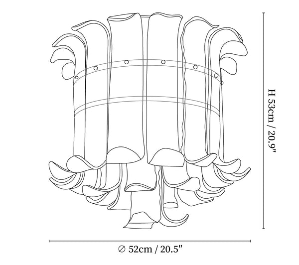 Die Valeria Murano Glas-Deckenlampe ist eine exquisite Fusion aus vintage Charme und moderner Eleganz. Mit wunderschön handgefertigten Murano-Glasplatten präsentiert diese Valeria Murano Glas-Deckenlampe filigrane, blütenblattartige Formen, die in einer anspruchsvollen, organischen Form herabfallen. Das strukturierte Glas fängt das Licht ein und reflektiert es, wodurch ein faszinierendes Leuchten entsteht, das jeden Raum in ein Kunstwerk verwandelt. Mit ihrem markanten Design und luxuriösen Reiz ist die Valeria Murano Glas-Deckenlampe das perfekte Zentrum, um zeitlose Raffinesse in Ihr Wohnzimmer, Esszimmer oder Foyer zu bringen.