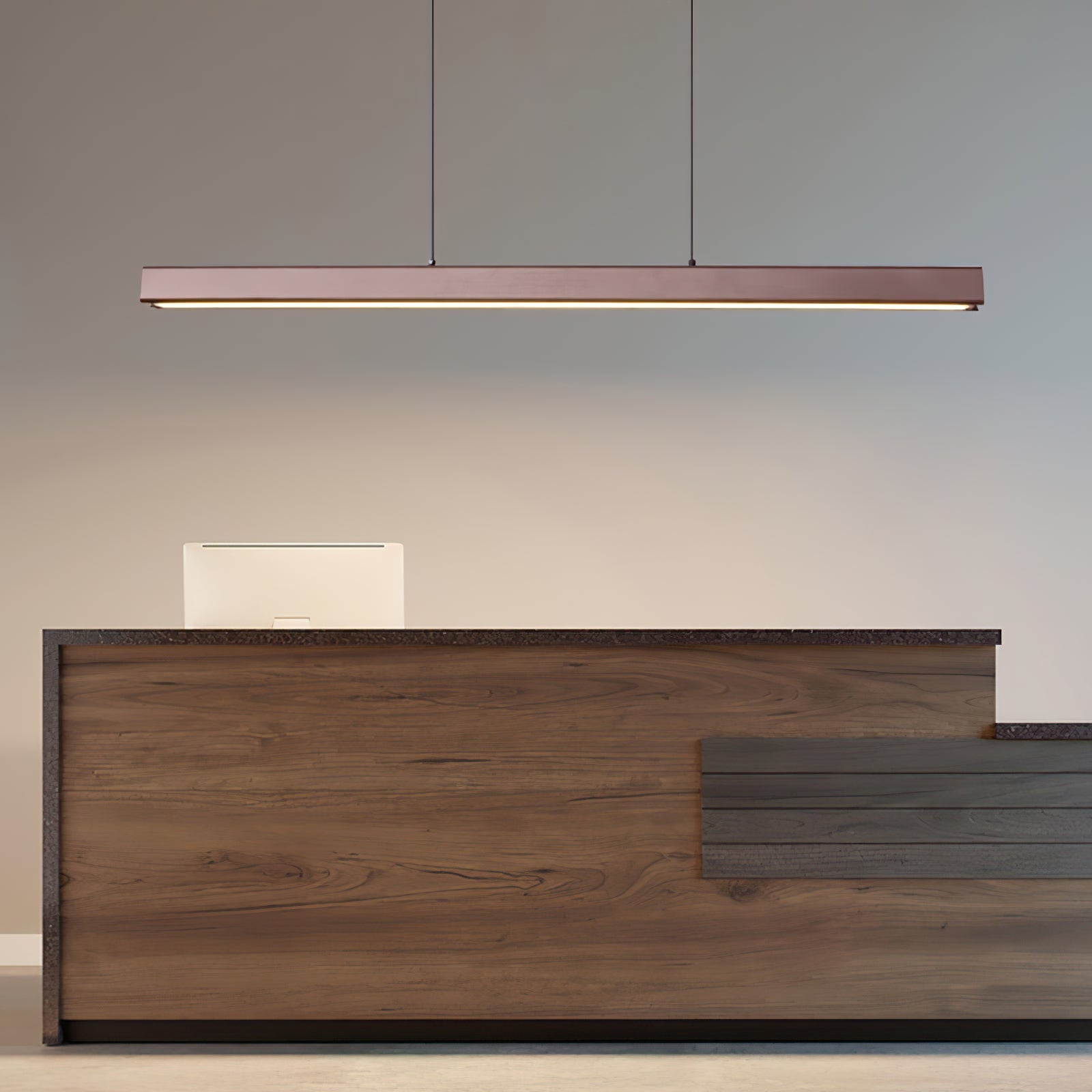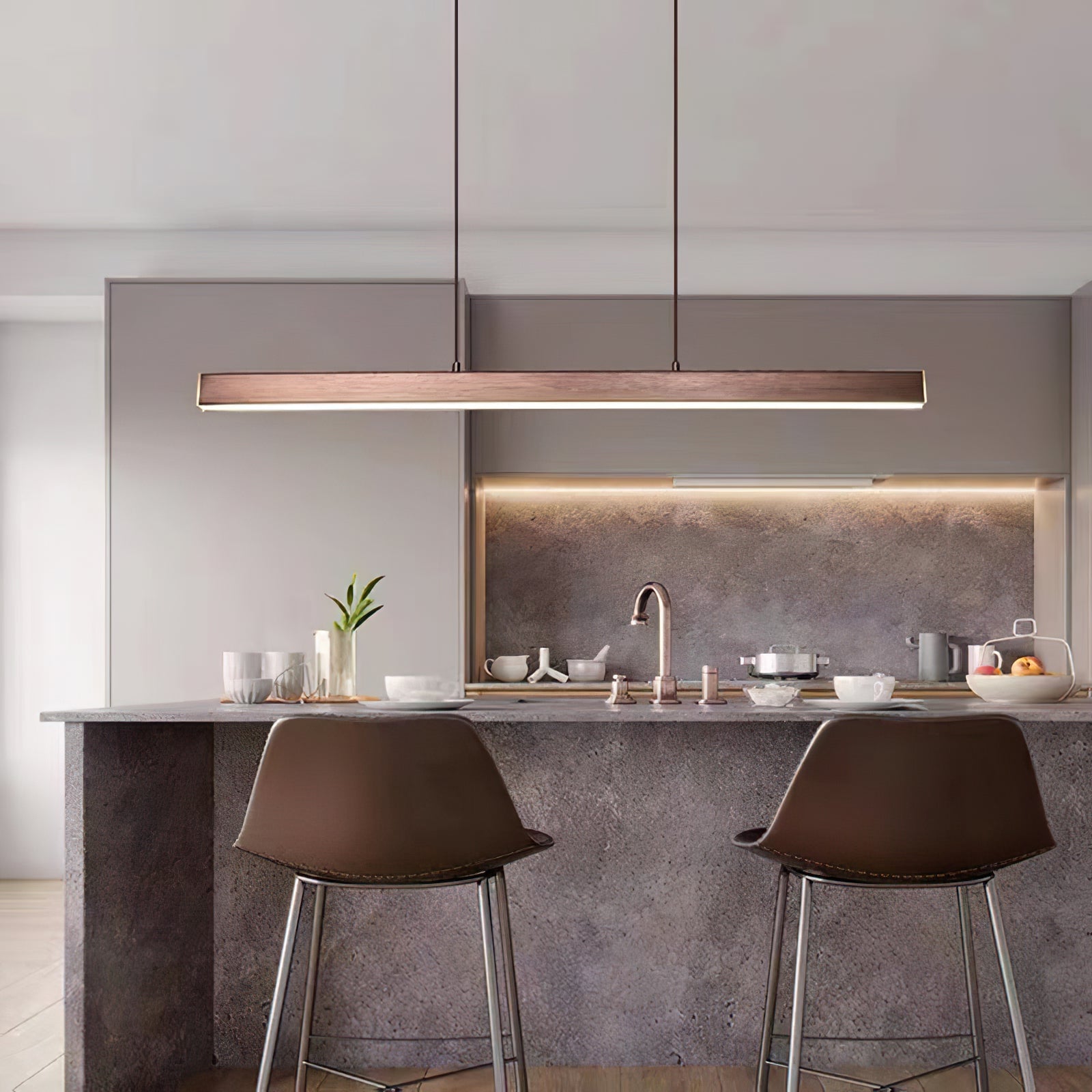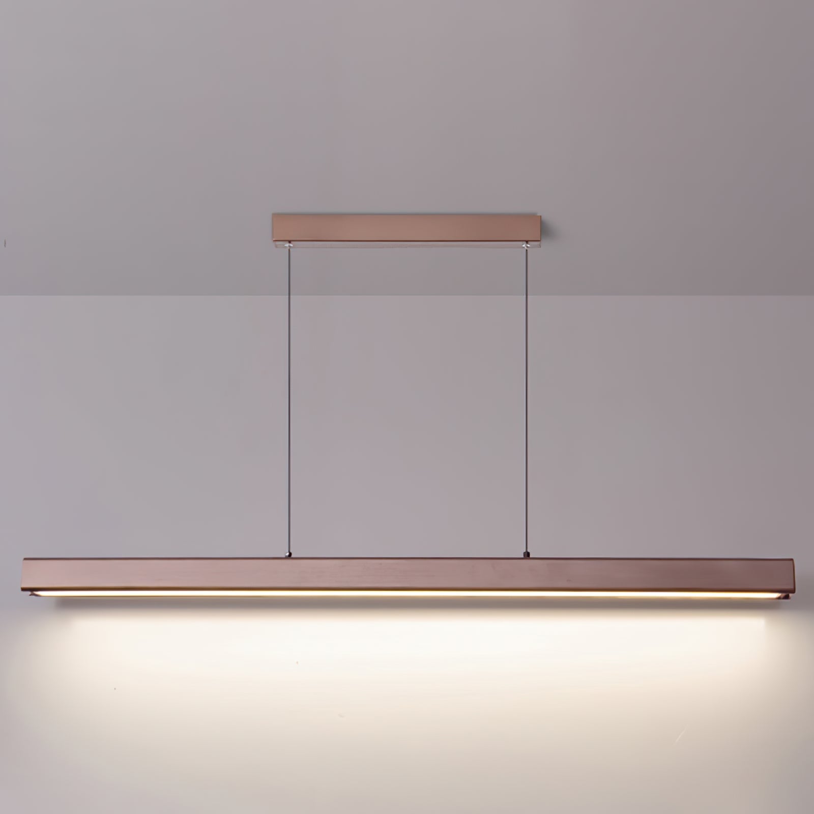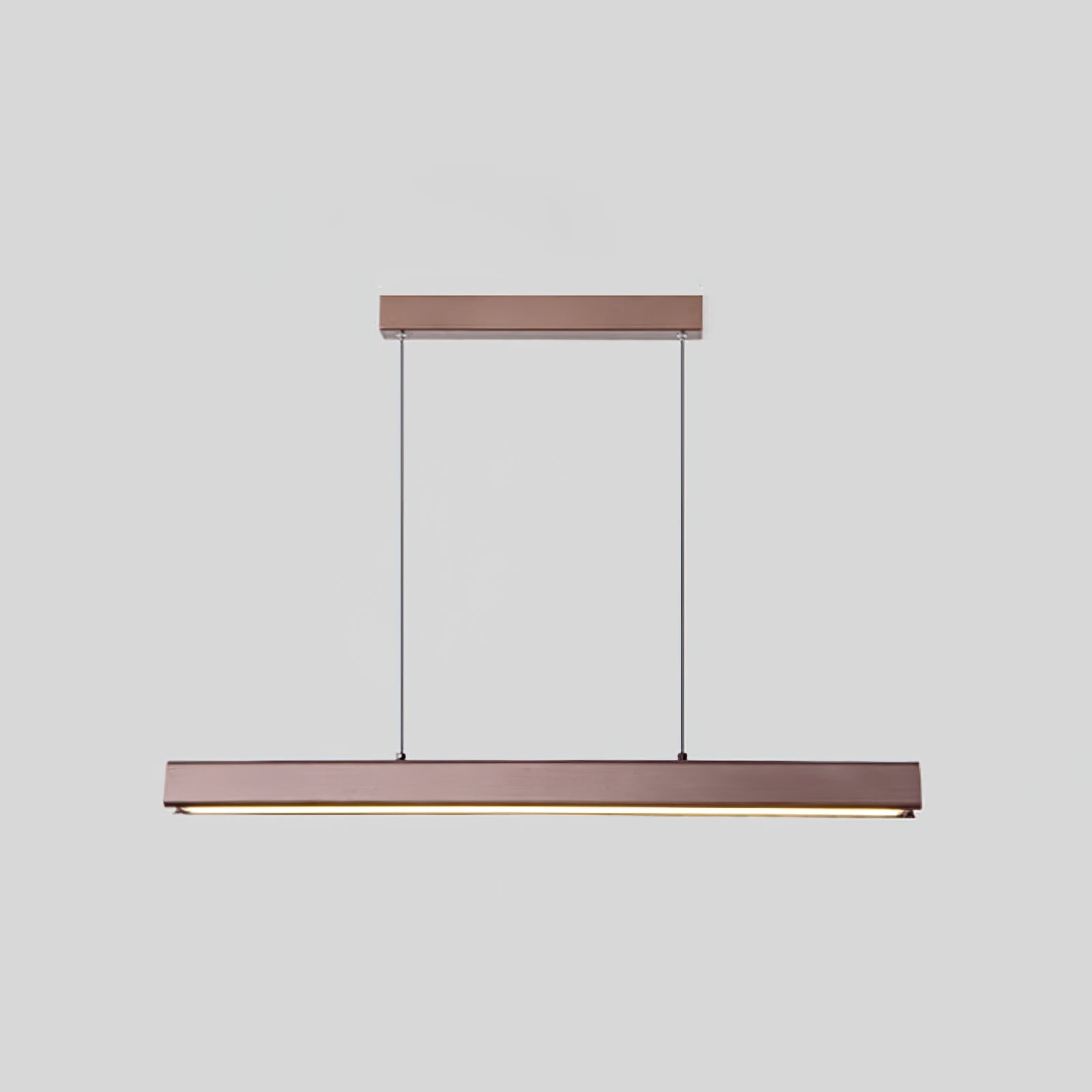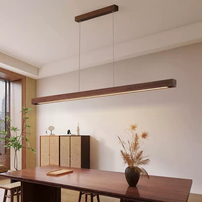 Diese minimalistische Holzpendelleuchte aus Walnuss verkörpert ein schlankes, modernes Design mit einem Hauch von natürlicher Eleganz. Ihr geradliniger, rechteckiger Holzrahmen, der in einem reichen Walnussfarbton gehalten ist, wird von zwei dezenten Kabeln gehalten, was einen schwebenden Effekt erzeugt. Das integrierte LED-Licht strahlt ein sanftes, gleichmäßiges Licht von unter dem Holzrahmen aus und sorgt für effiziente, stimmungsvolle Beleuchtung, die ideal für Essbereiche, Kücheninseln oder Büros ist. Mit ihrer minimalistischen Ästhetik und dem warmen Holzfinish verleiht diese Leuchte zeitgenössischen, skandinavischen oder minimalistischen Innenräumen einen raffinierten, aber unaufdringlichen Charme und bereichert den Raum sowohl funktional als auch stilvoll.